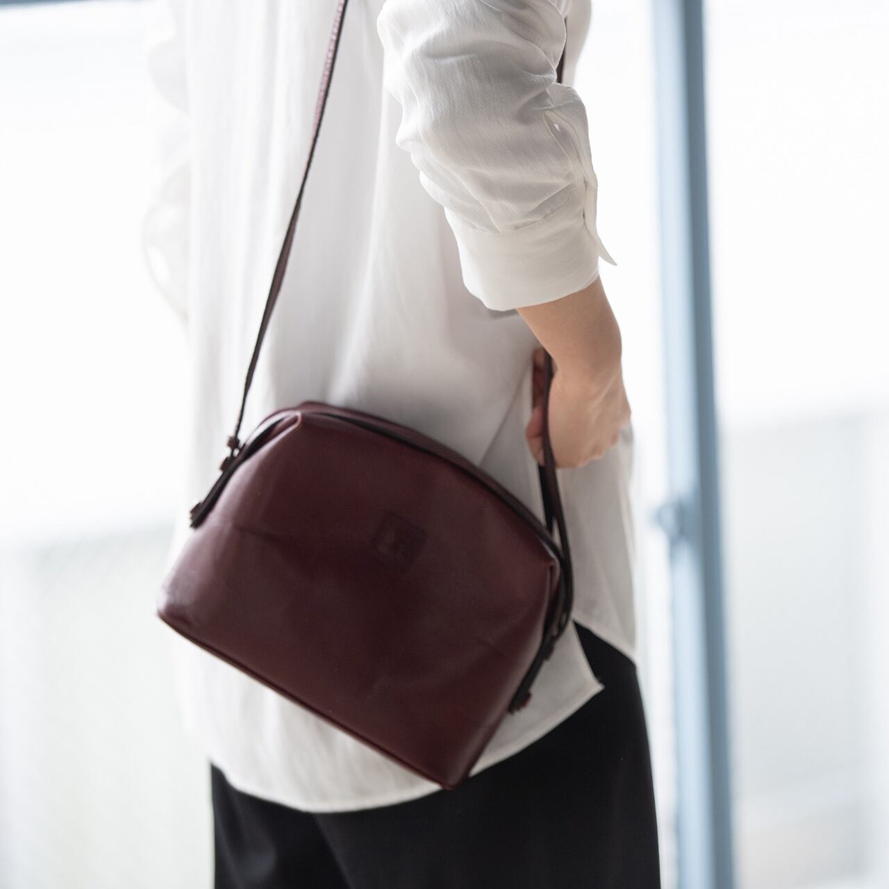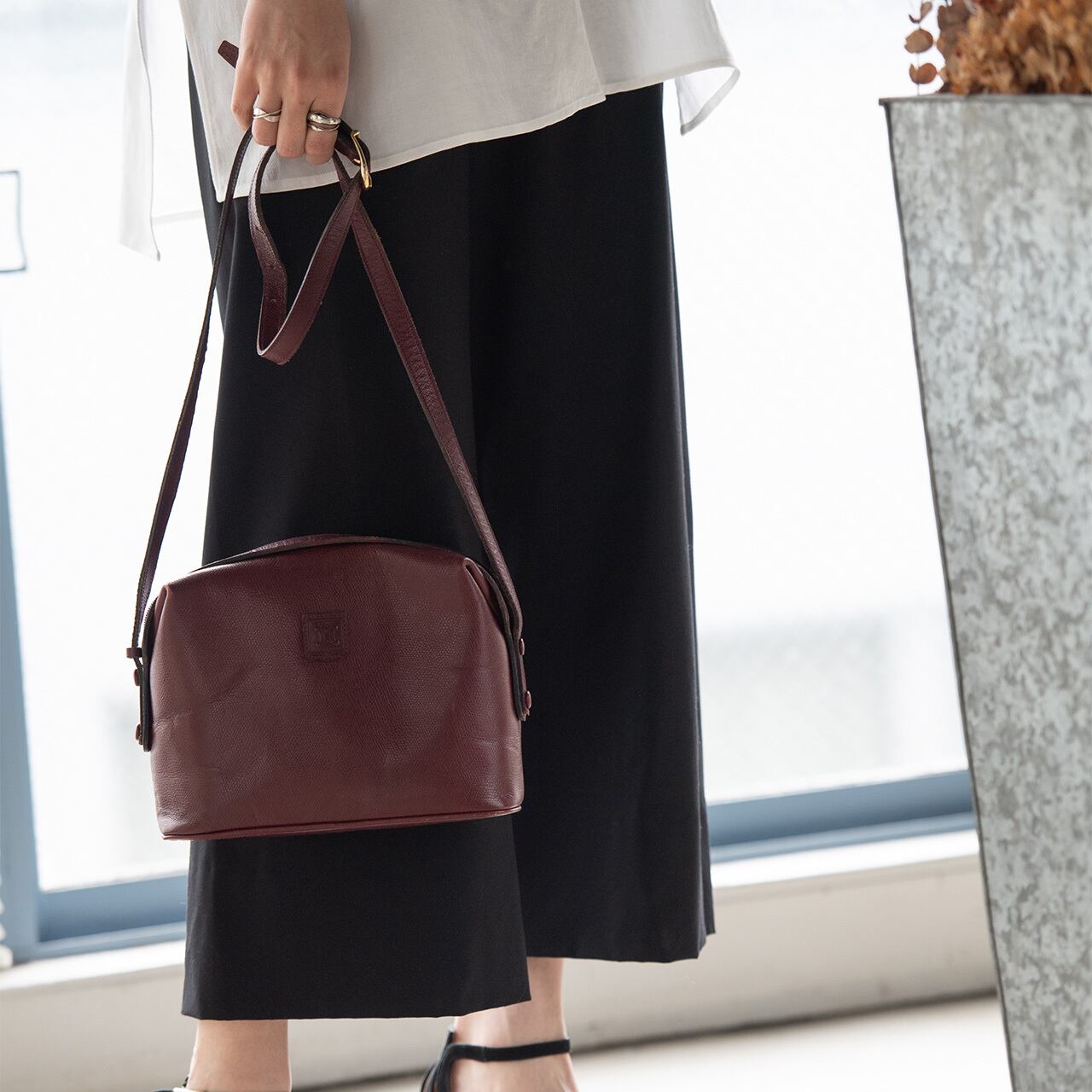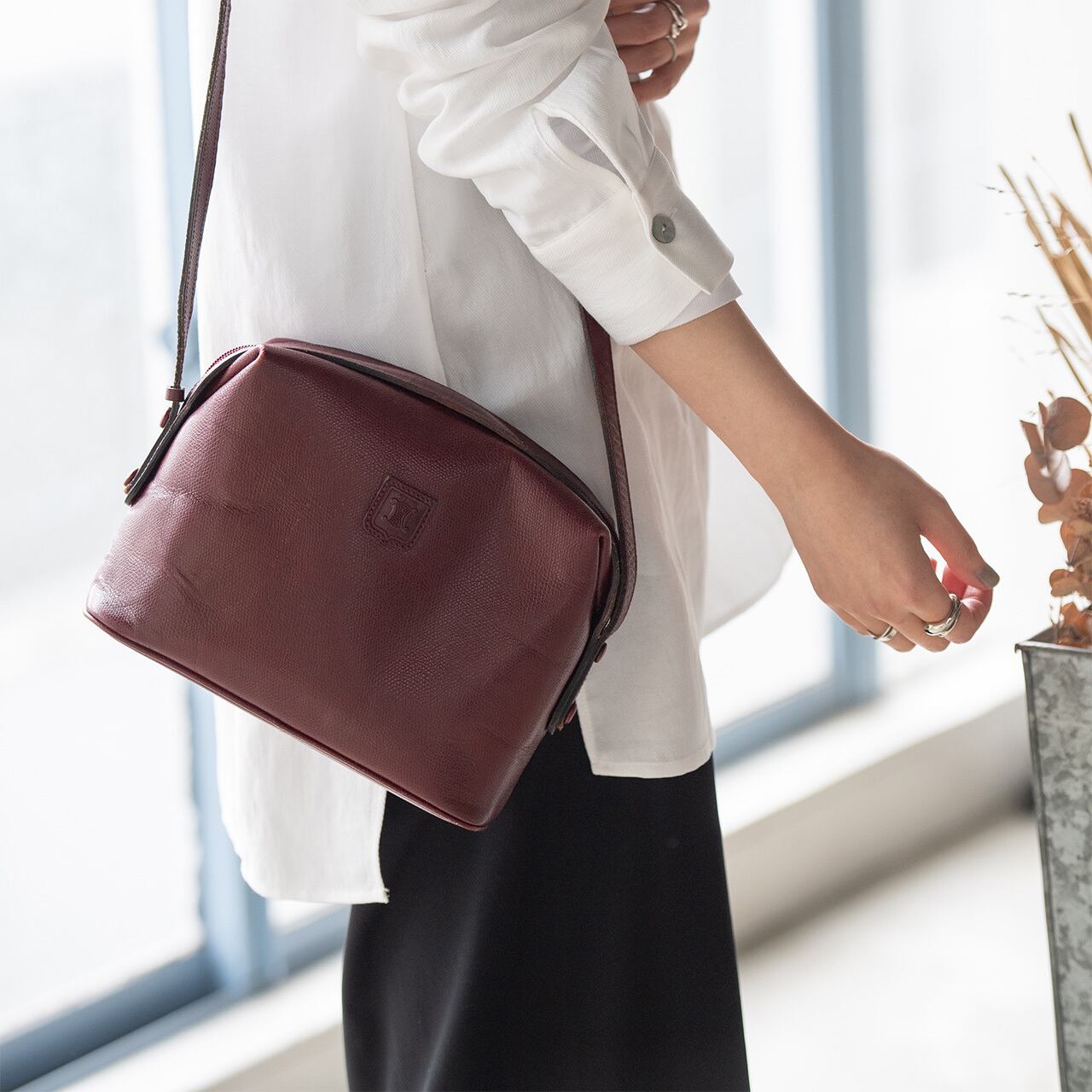 ワインレッドの丸みのあるフォルムに、ワンポイントでマカダム模様がエンボスされたシンプルなデザイン。