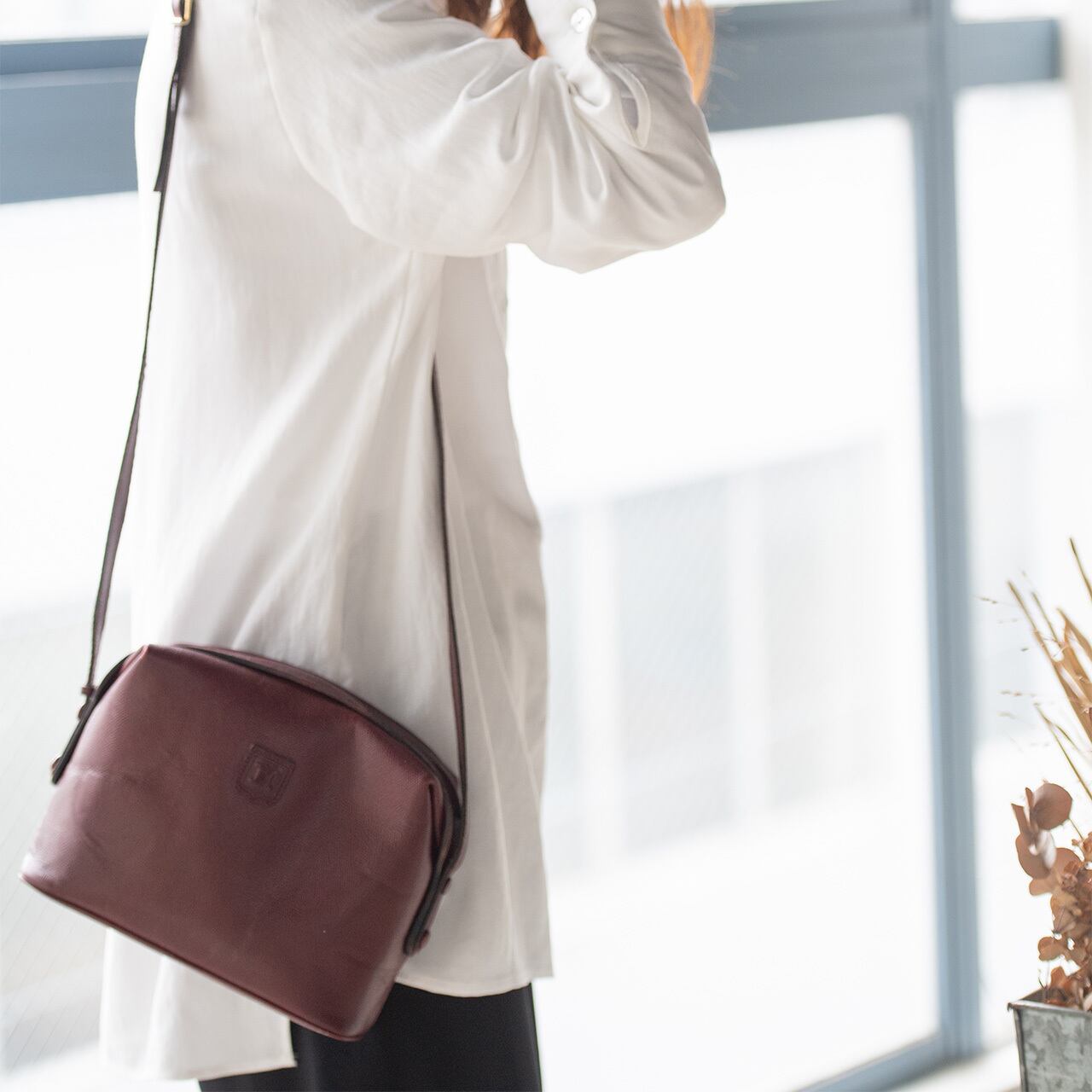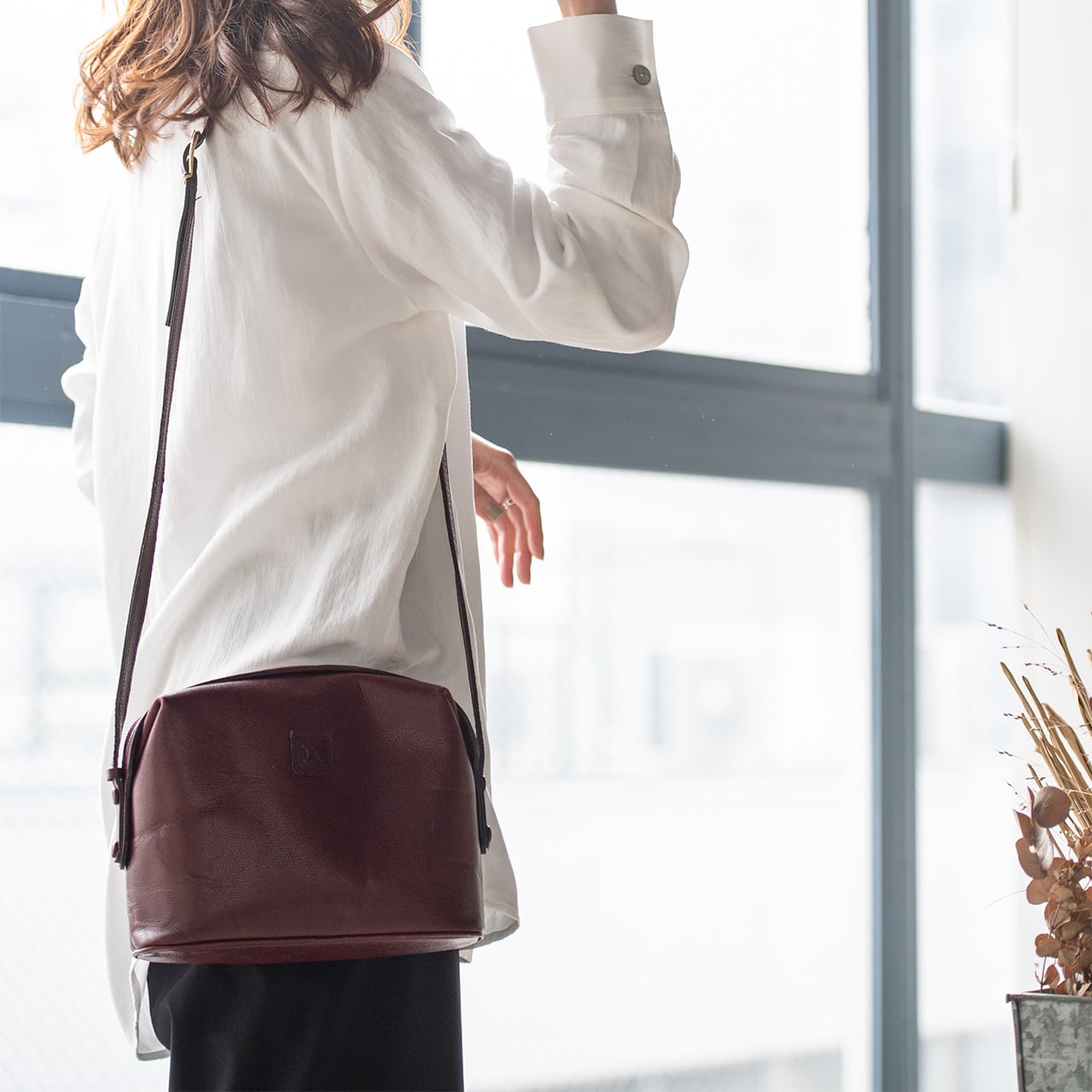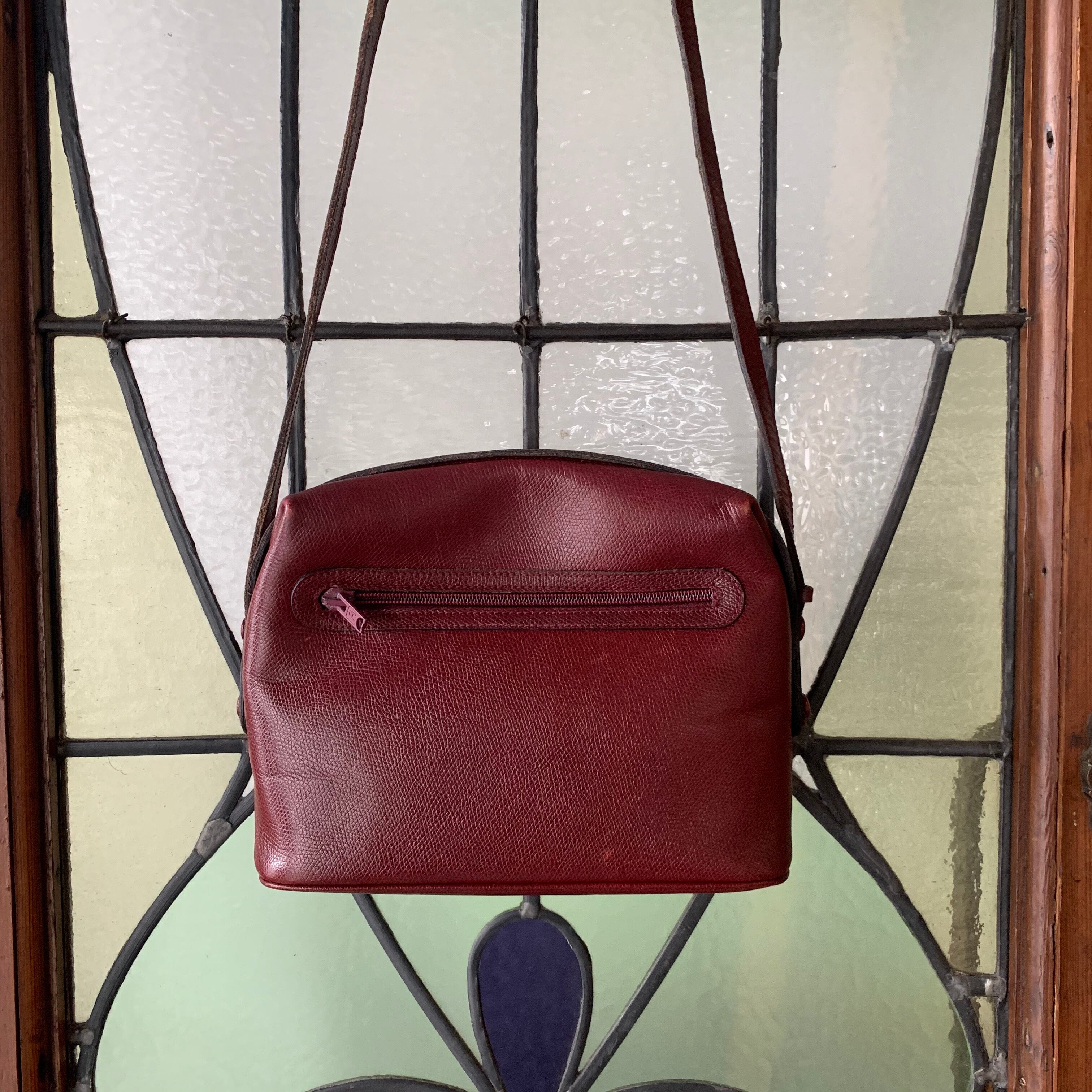 ワインレッドの丸みのあるフォルムに、ワンポイントでマカダム模様がエンボスされたシンプルなデザイン。