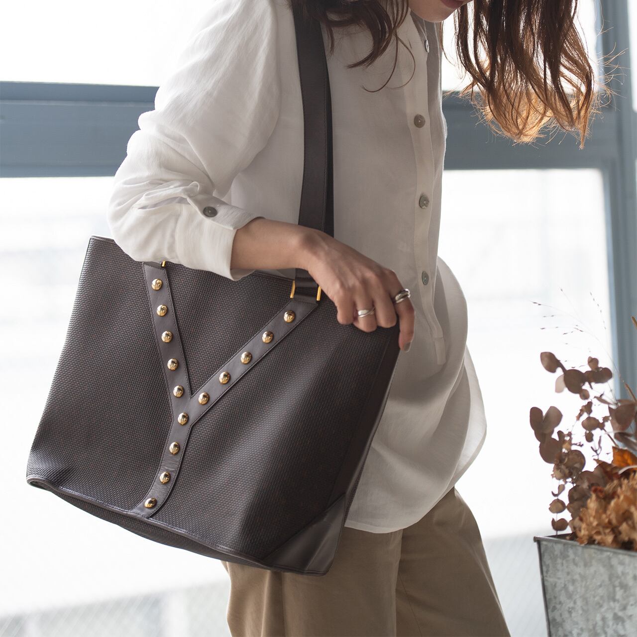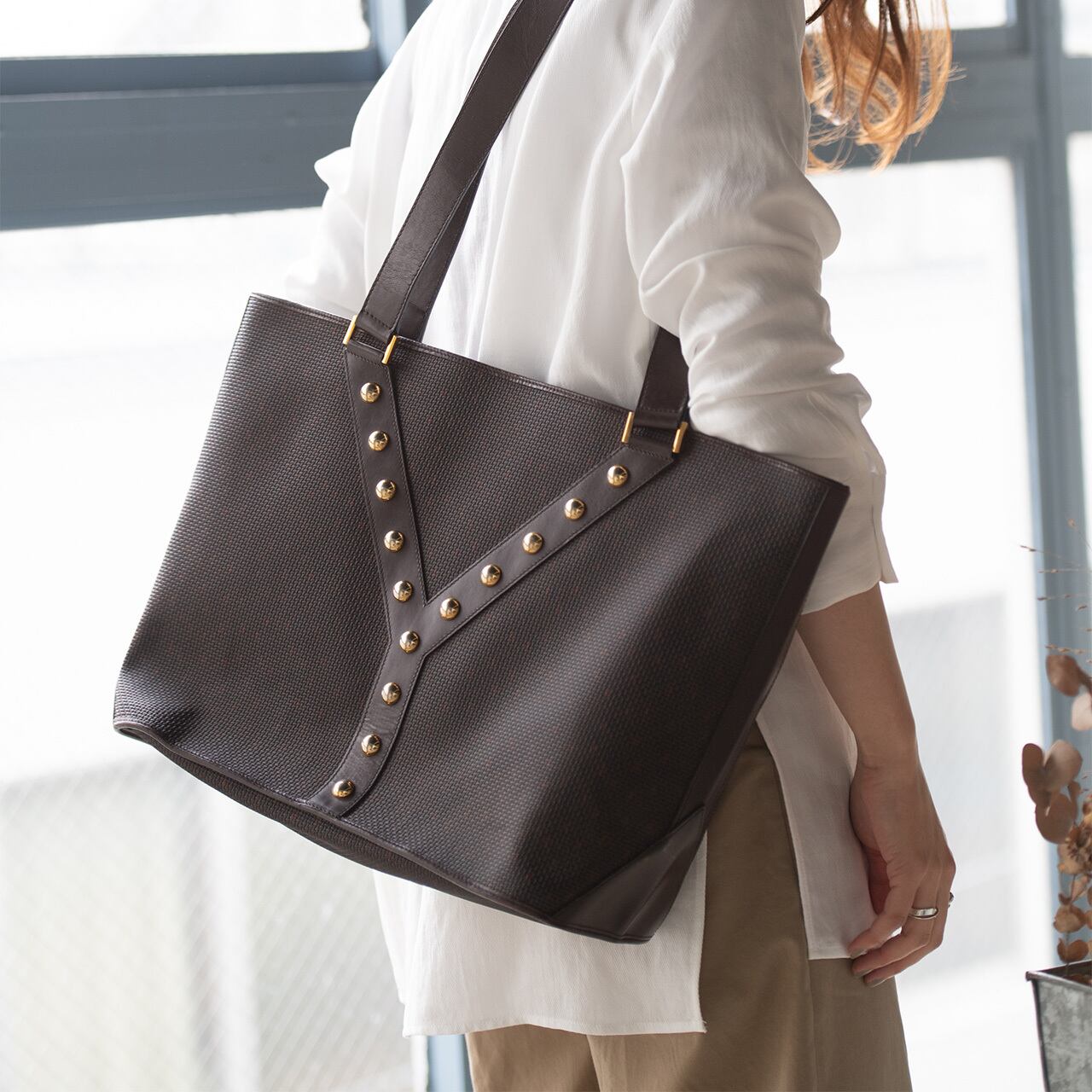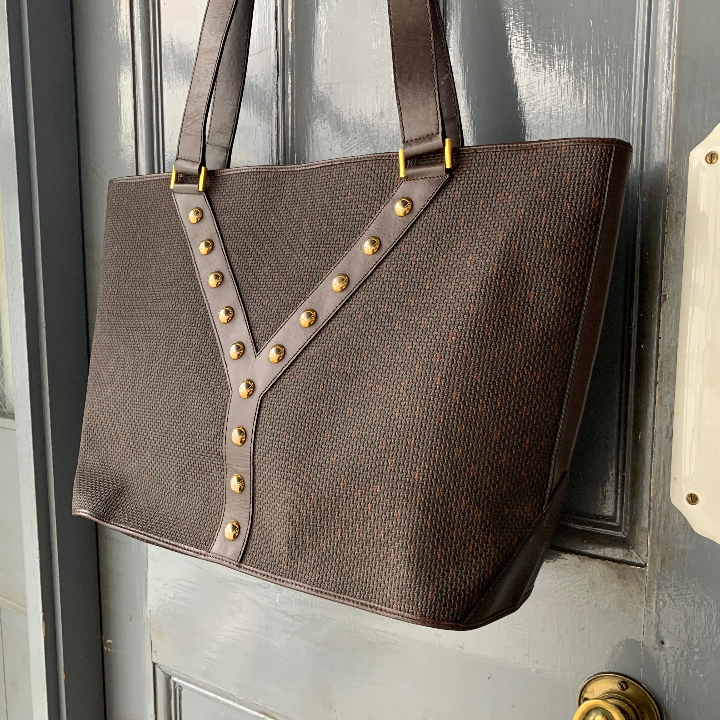 イヴサンローランの頭文字Yに整列したスタッズが目をひく絶妙なブラウンカラーのトートバッグ。
