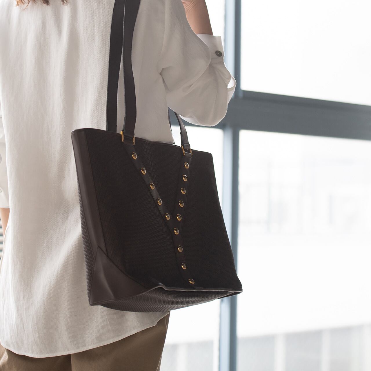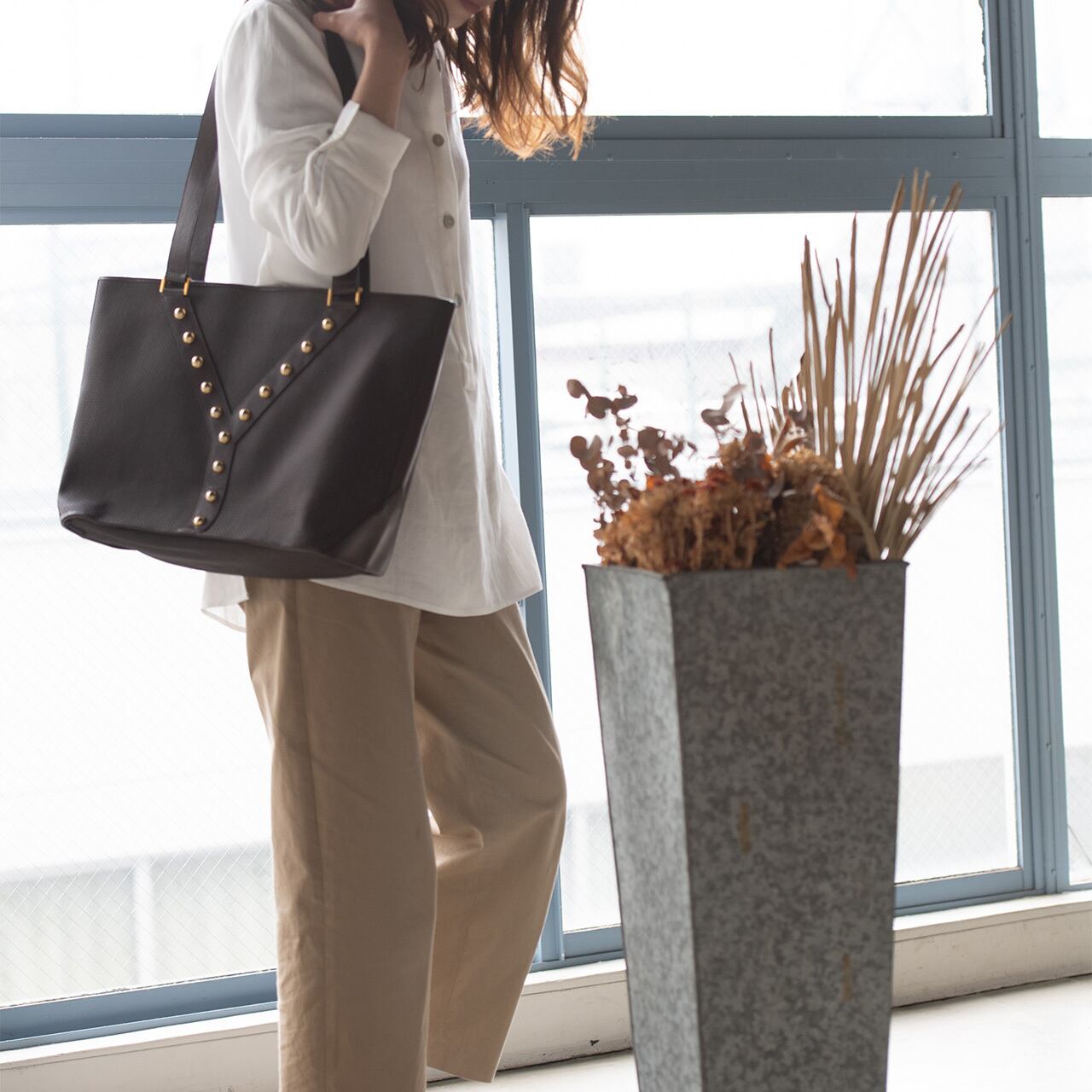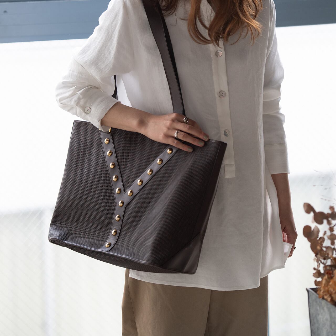 イヴサンローランの頭文字Yに整列したスタッズが目をひく絶妙なブラウンカラーのトートバッグ。