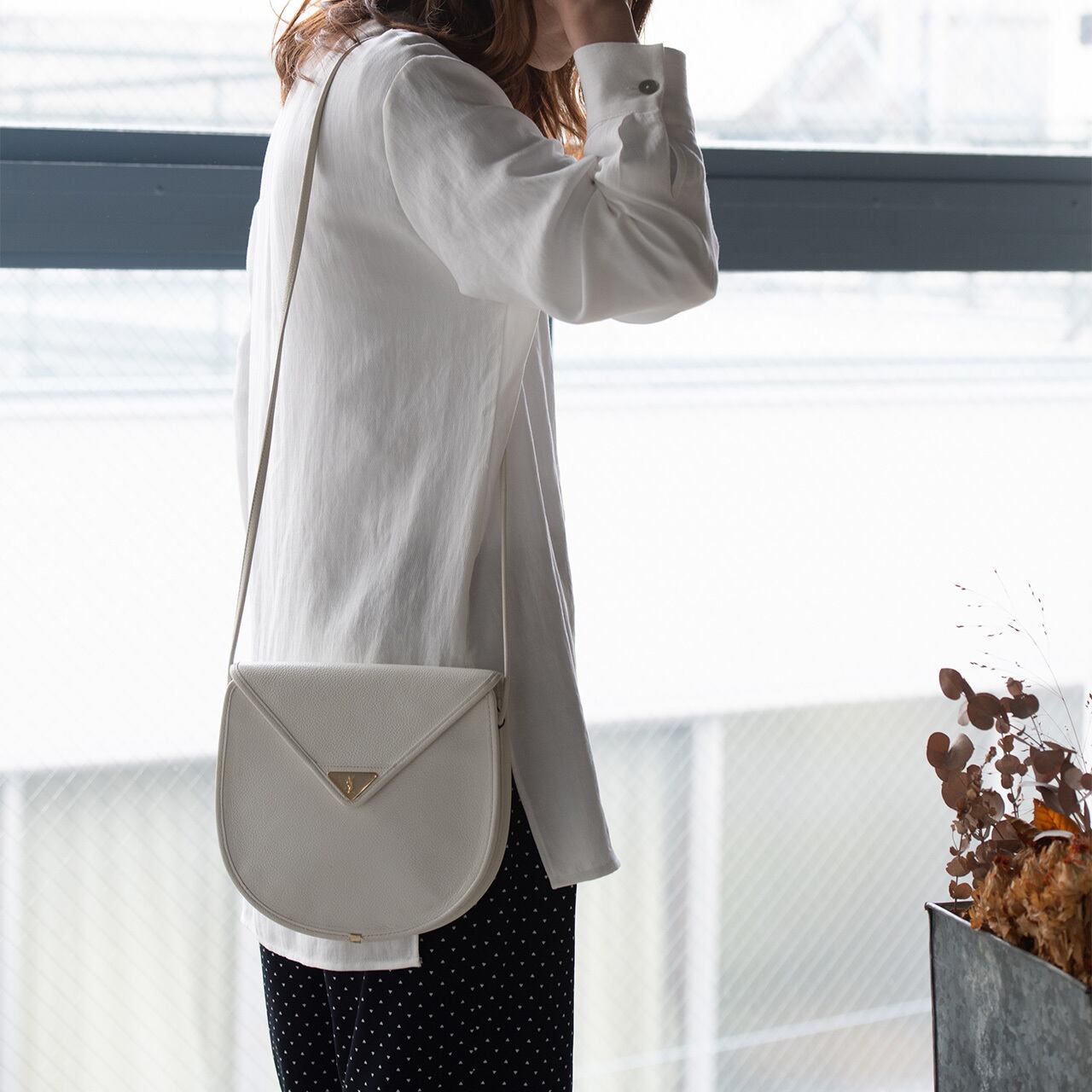 細めのショルダーと丸みのあるフォルムが大人の女性に仕立ててくれます。