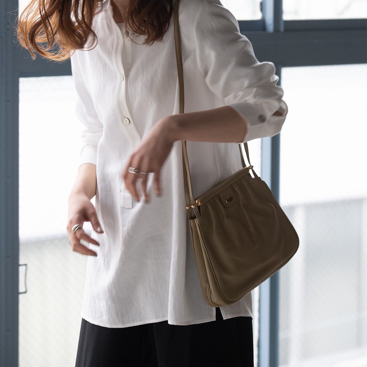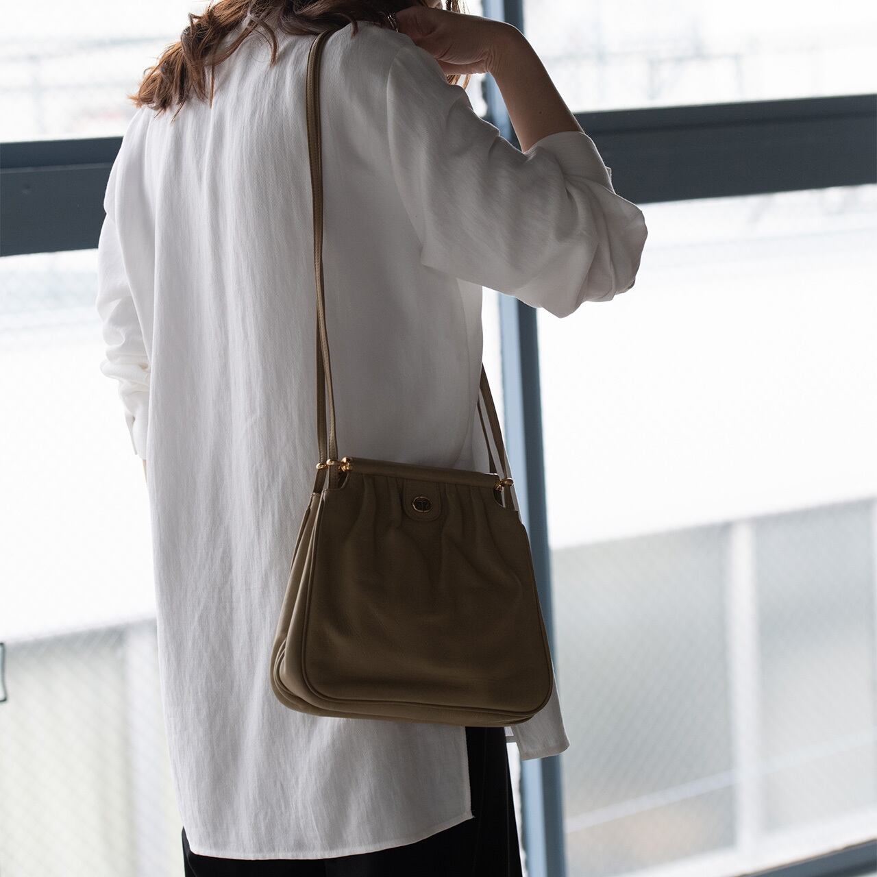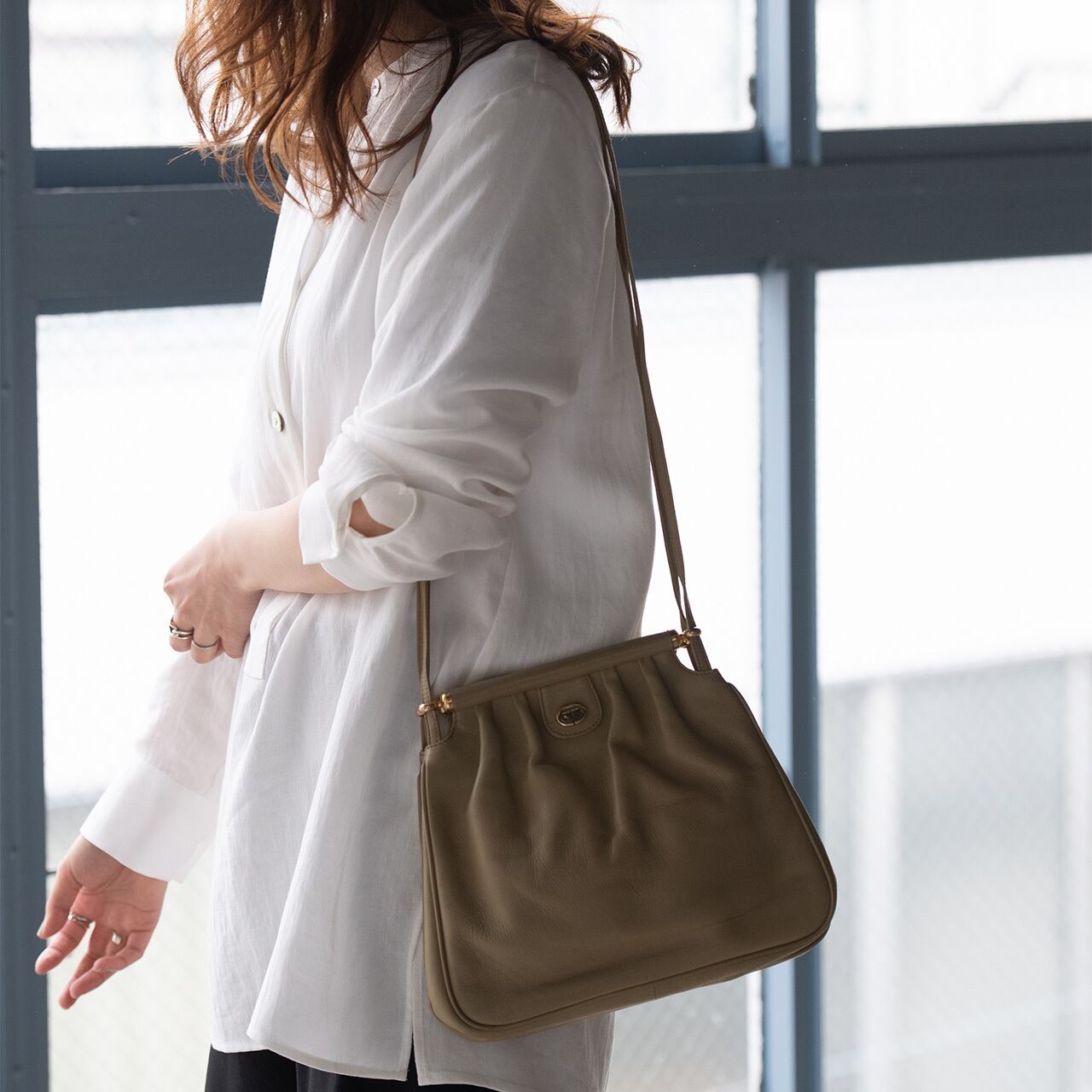 落ち着いたカラーと、細めの2本のショルダー、ギャザーの入ったボディは女性らしさと優雅さを兼ね備えています。