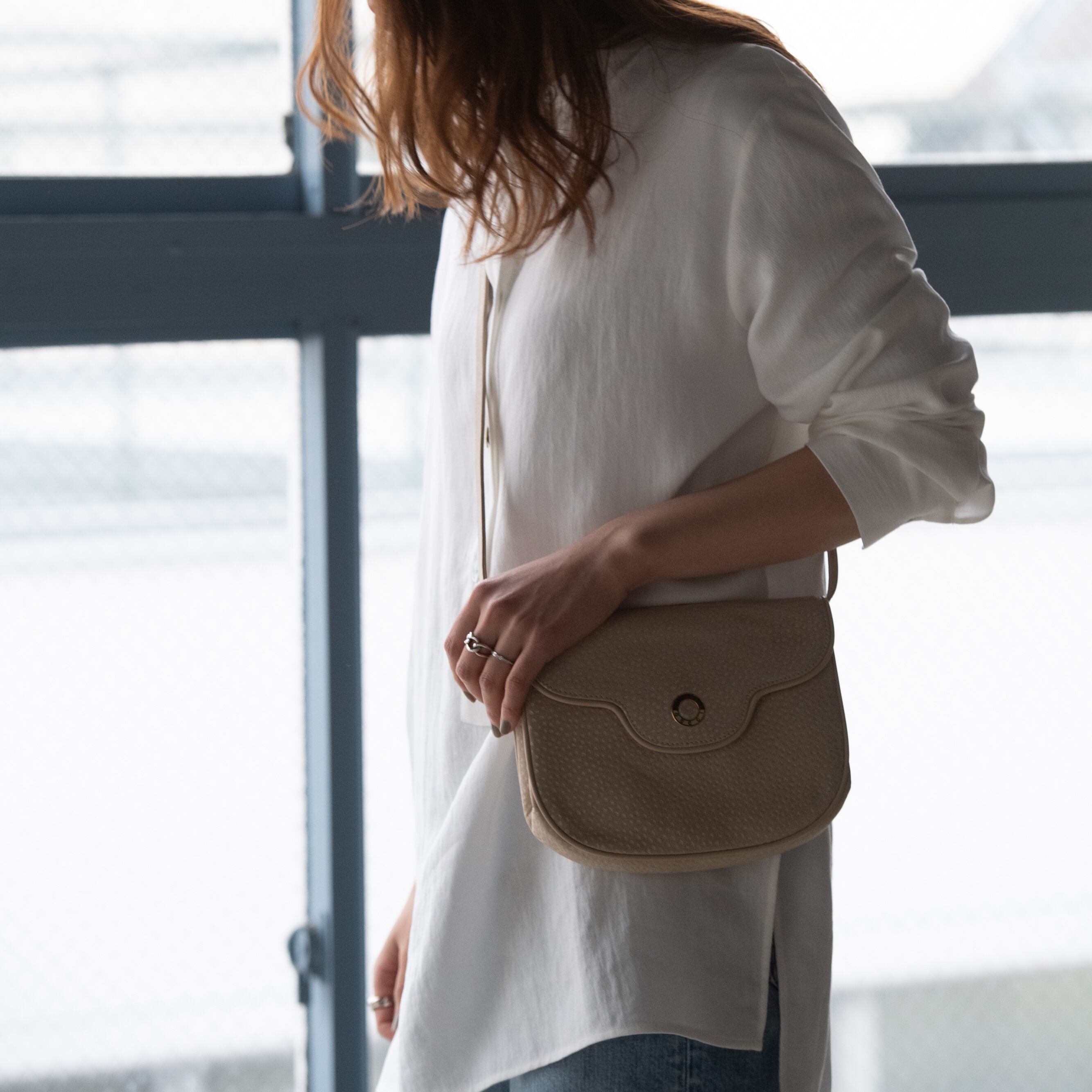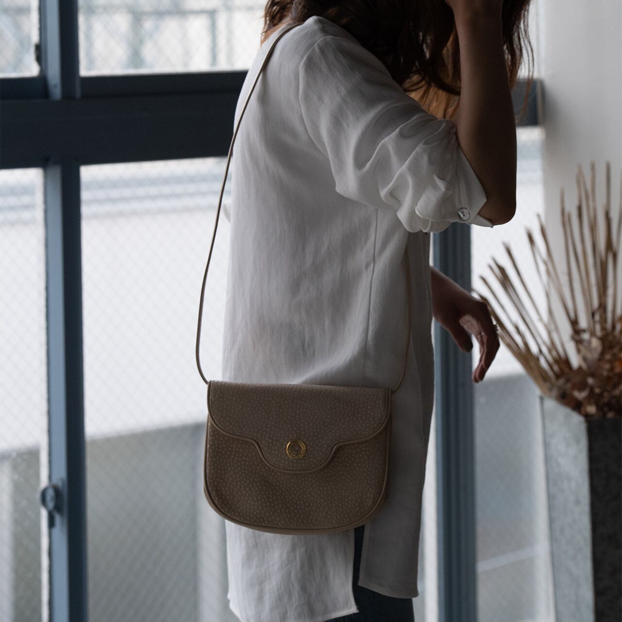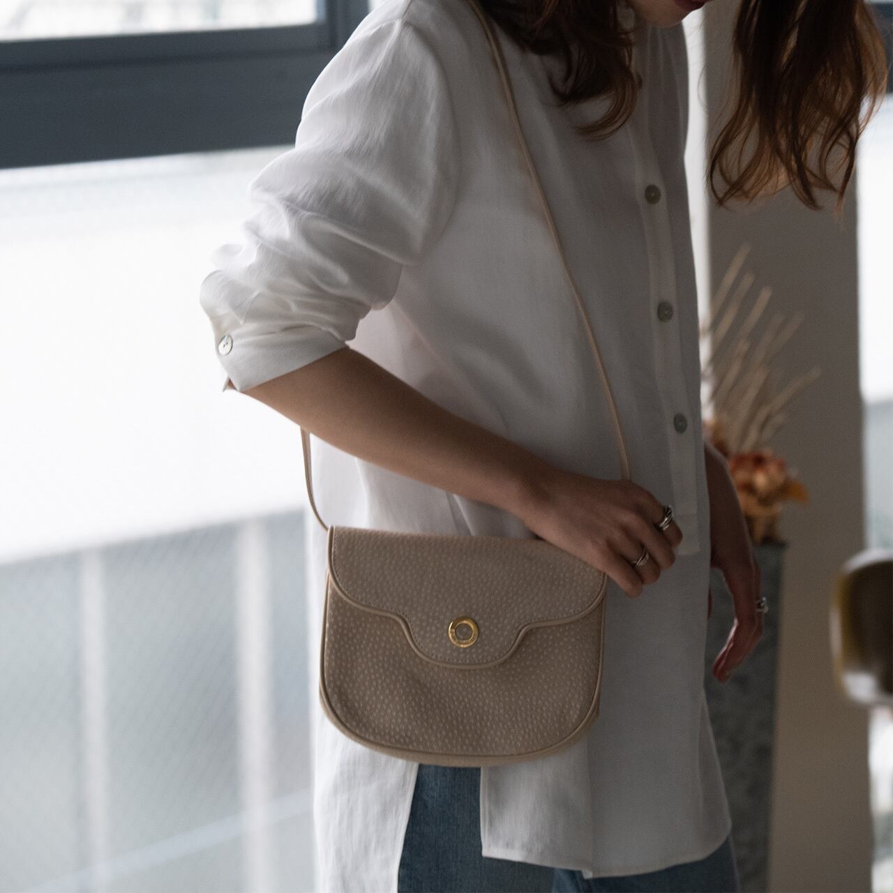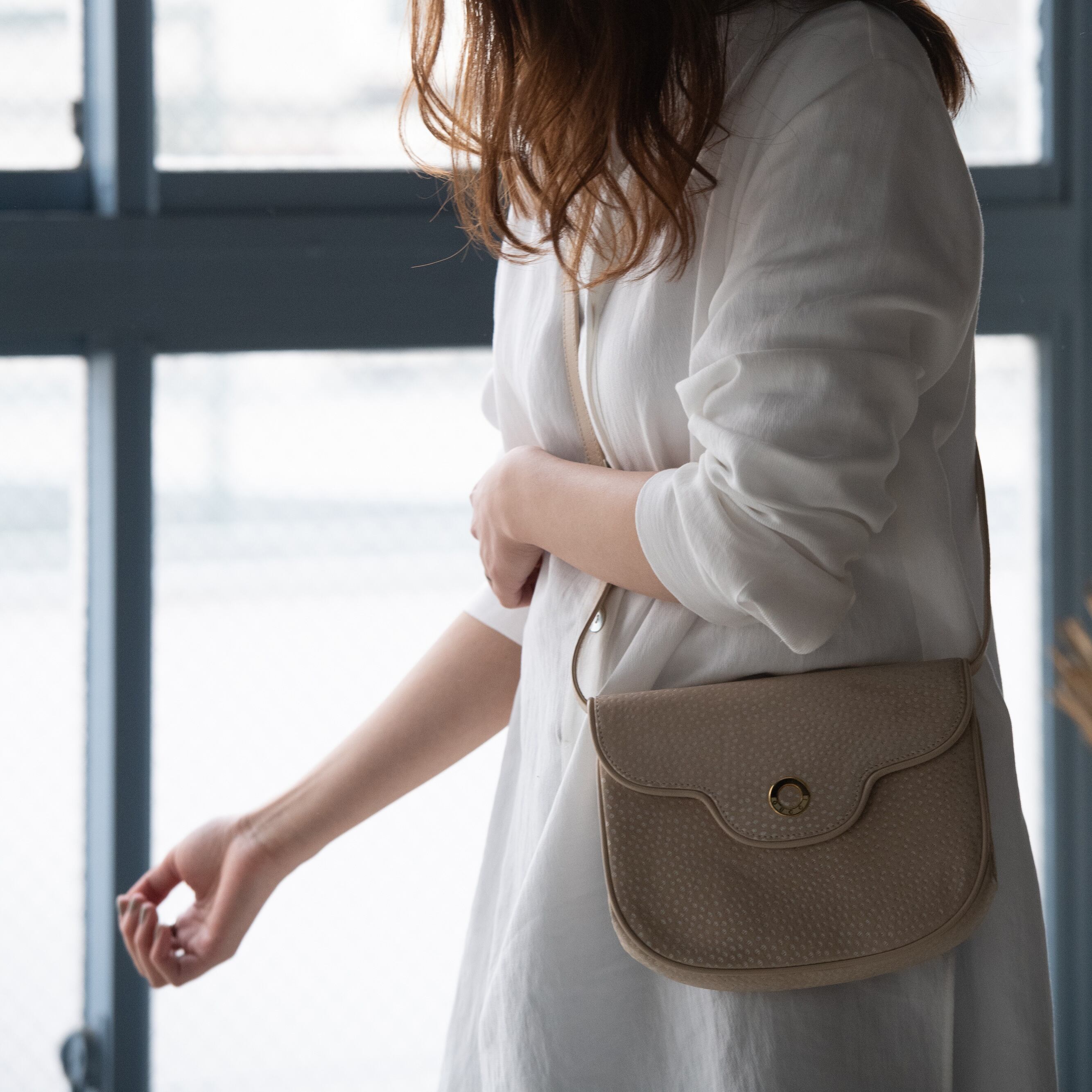 優しいクリームカラーが、柔らかな印象を与えるショルダーバッグ。