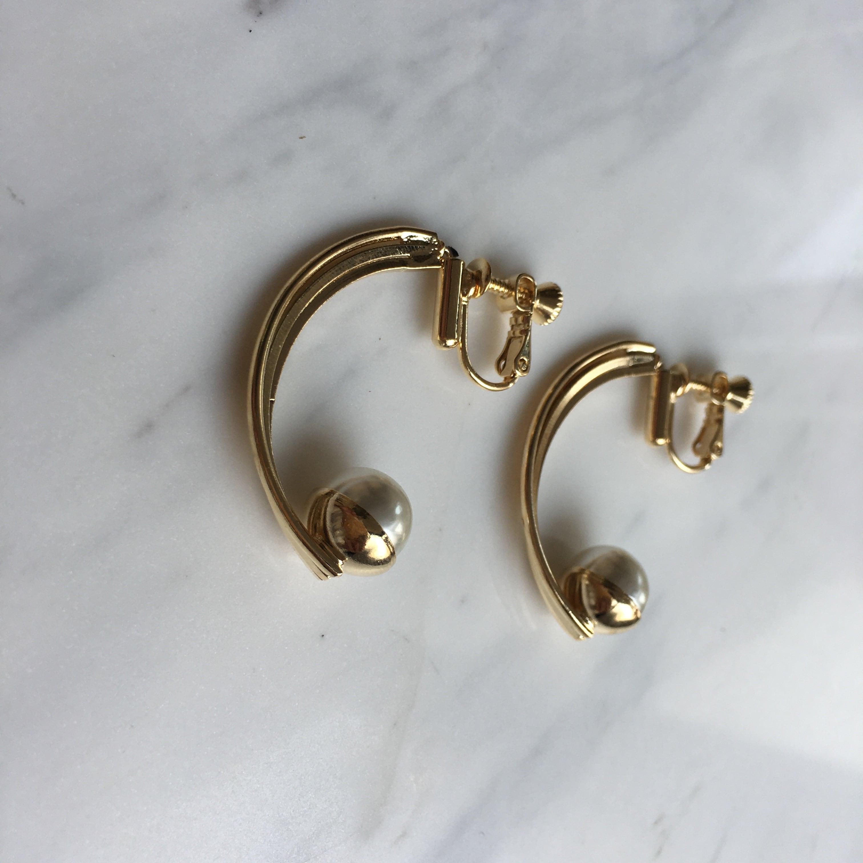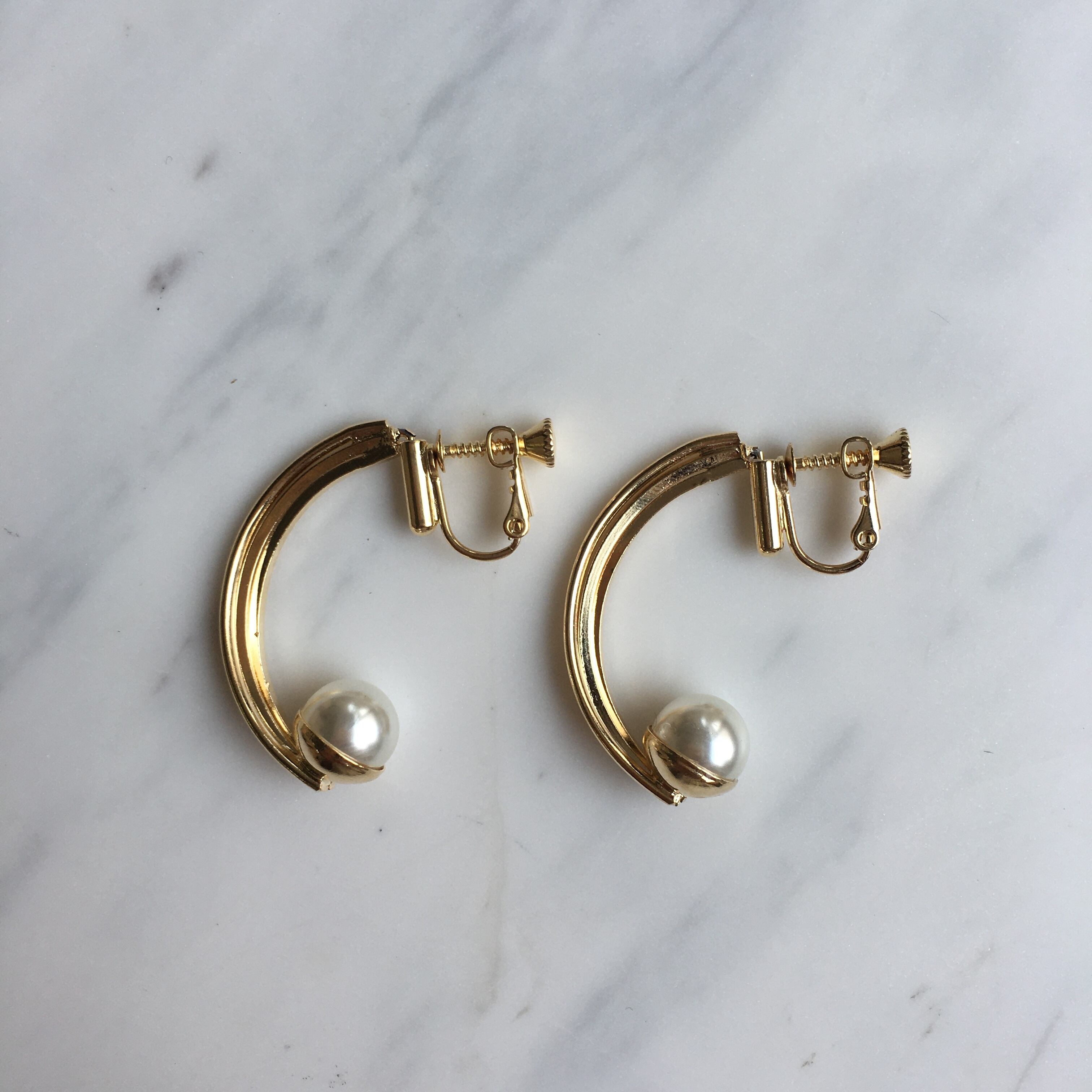 半月型のフープピアスに一粒のパールをあしらったレディなイヤリング。