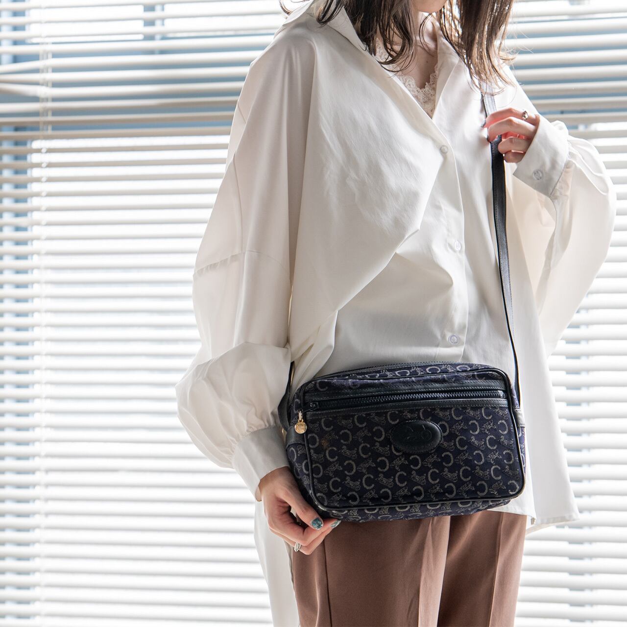CELINEのアイコニックであるサルーキー柄が全面にデザインされた、使いやすいサイズ感のショルダーバッグ。