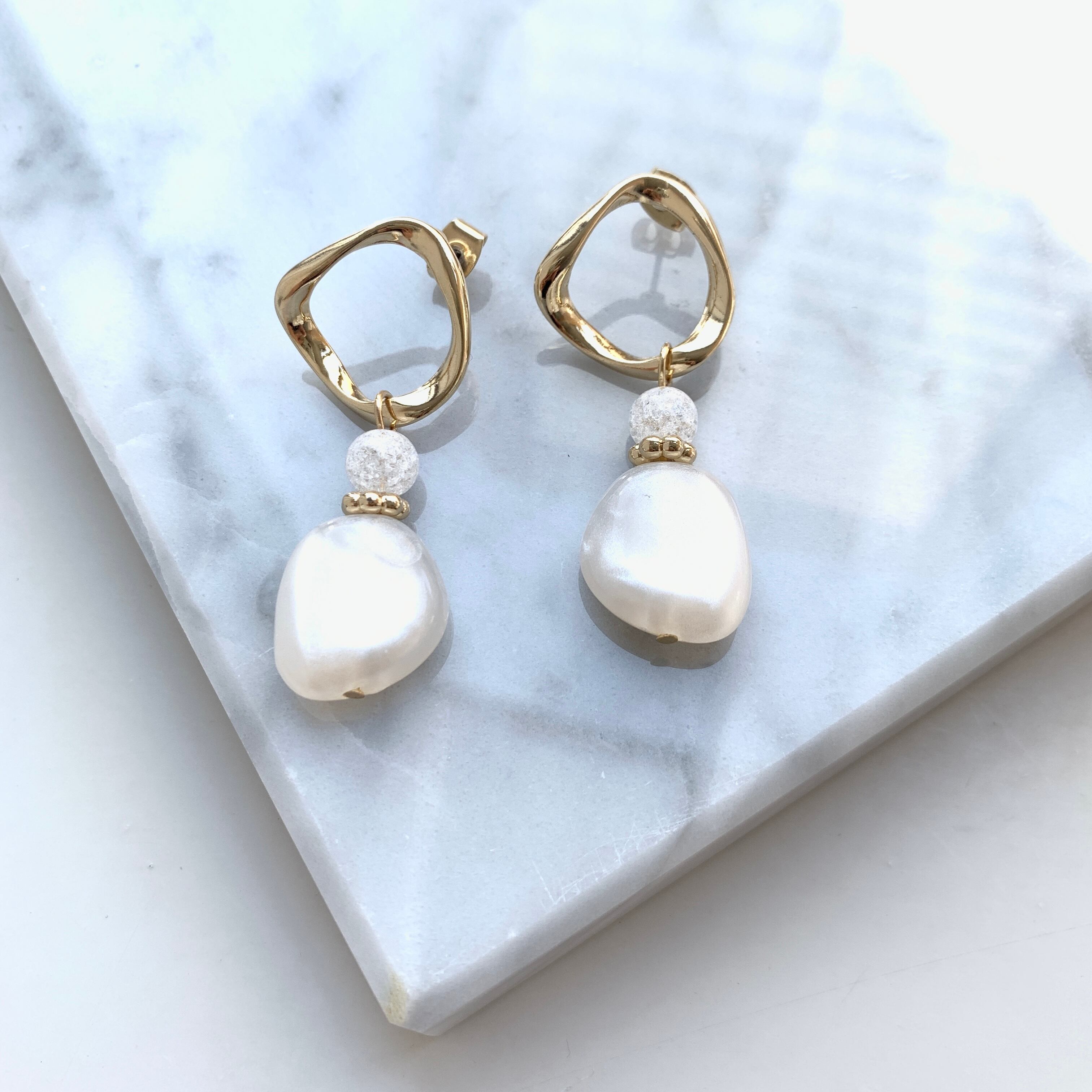 凹凸のあるパールとメタル素材のサークルを合わせたイヤリング。