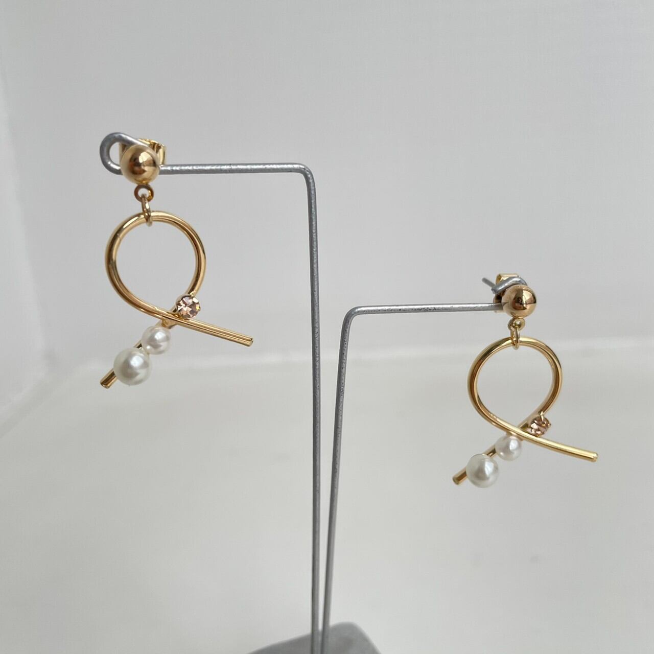 くるりとクロスさせたメタルバーの端に小さなビジューを添えたデザイン。