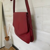 多角のデザインが印象的なフラップ部分には、大きなYSLのロゴがステッチされています。