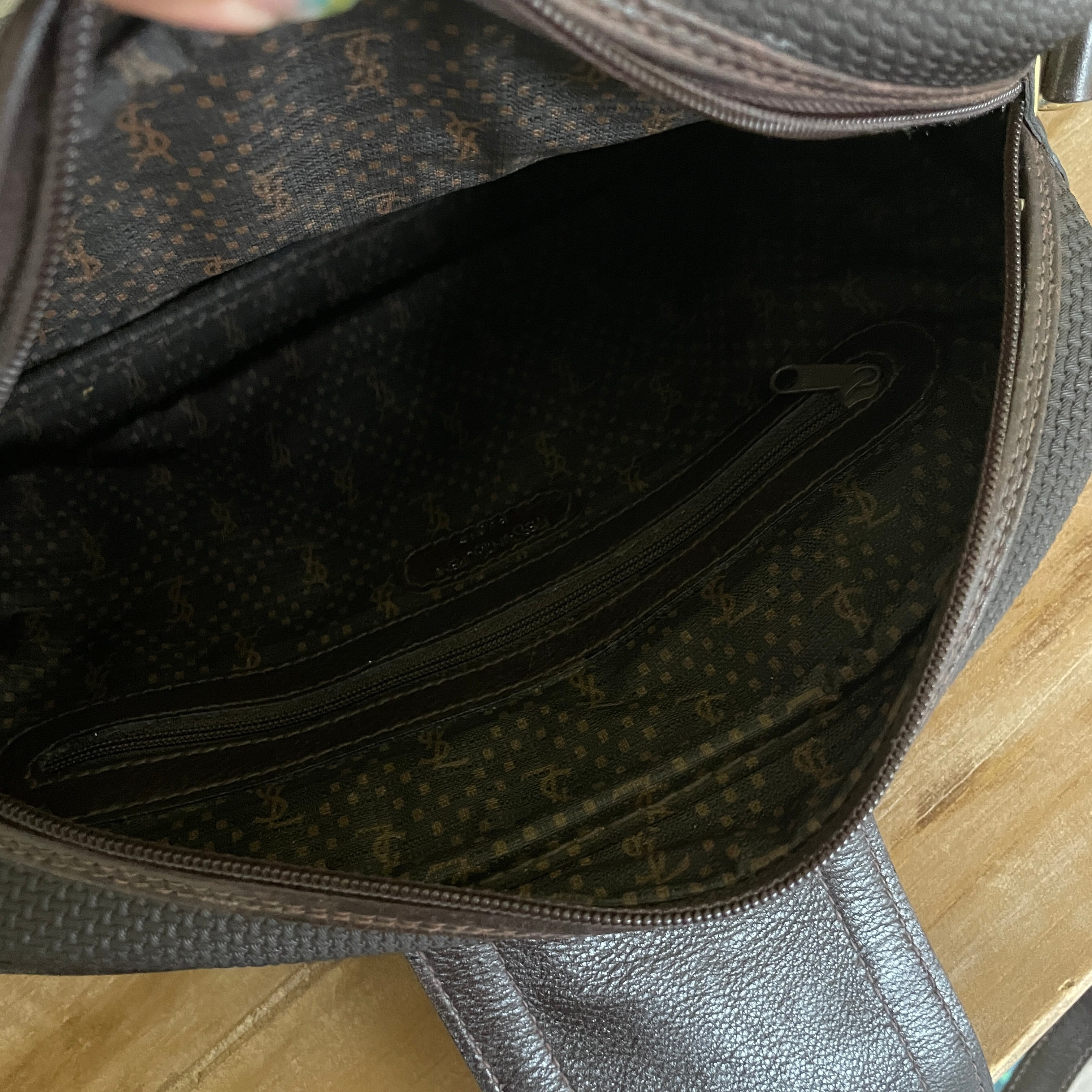 エンボス加工を施したカサンドラロゴがポイントになった、ダークブラウンのボディが魅力のvintage YSLのショルダーバッグ。
