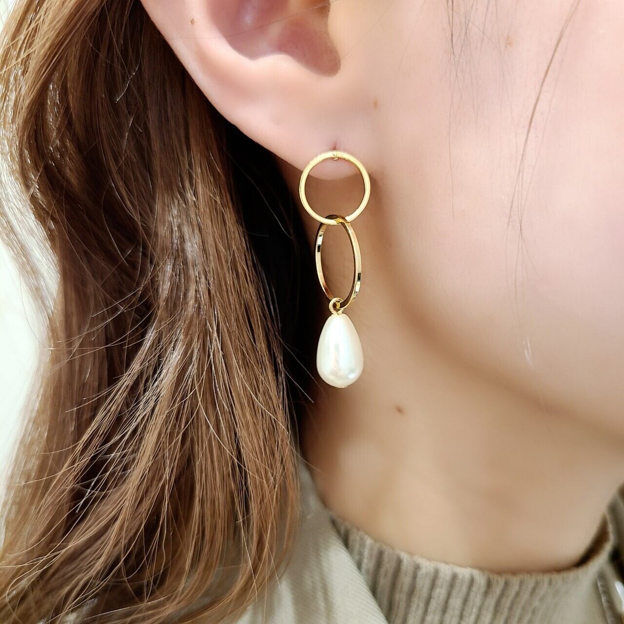 〈ピアス〉ダブル サークル ドロップ パール ピアス p-0172