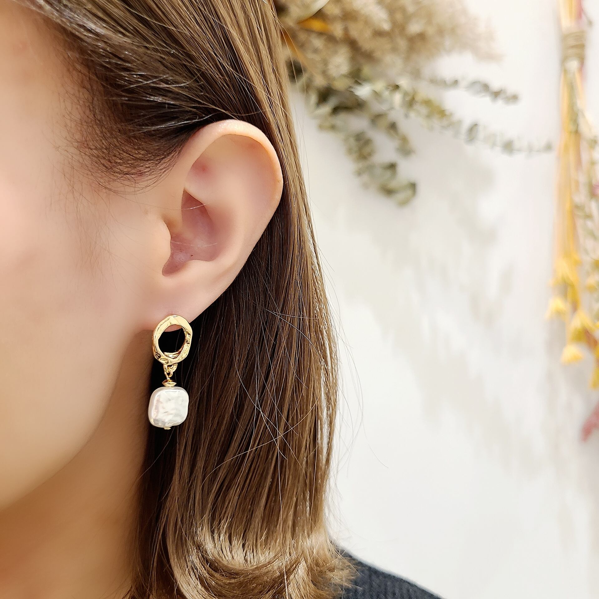 叩きのニュアンスデザインの入ったメタルサークルと淡水パールの歪さが可愛い一点。