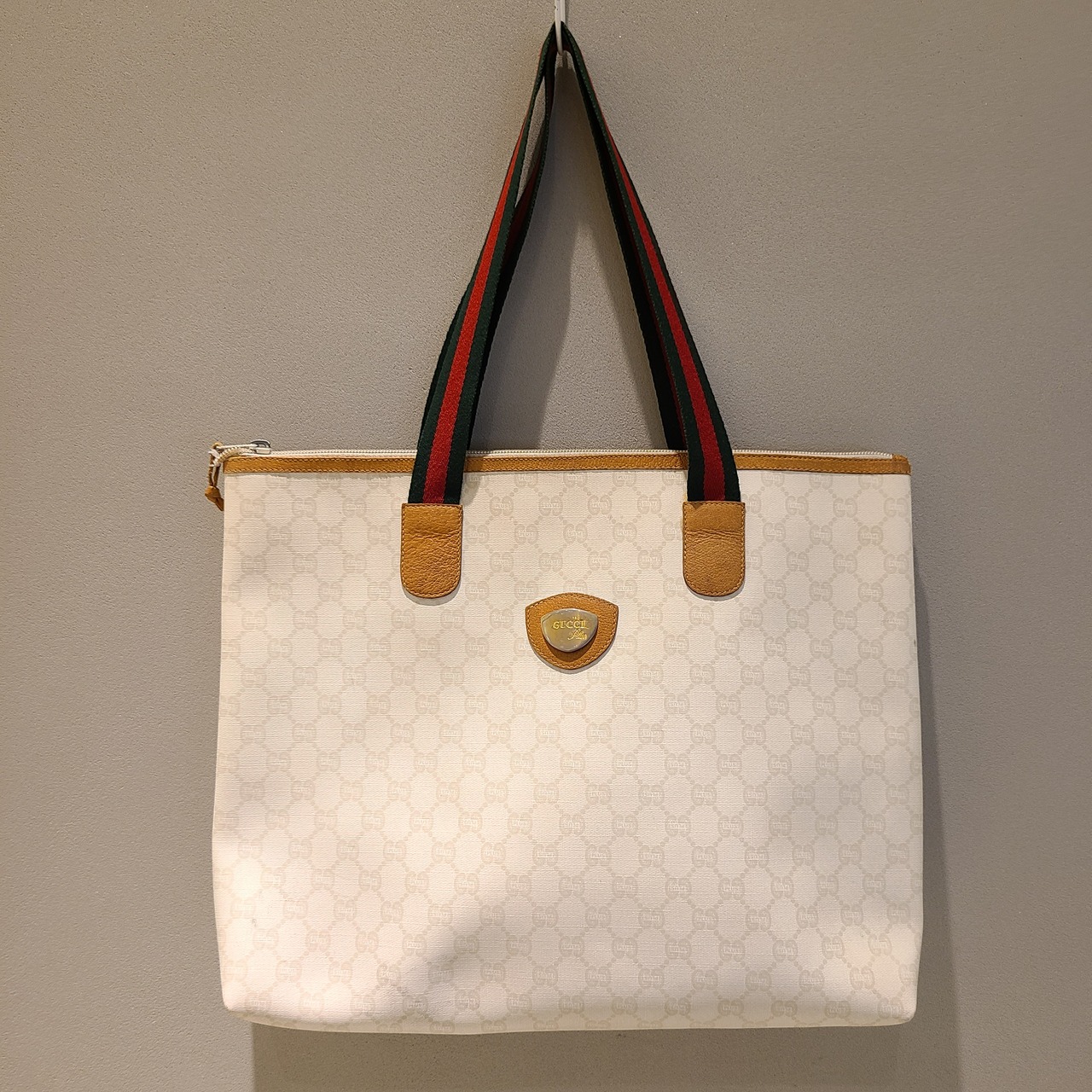 正方形のホワイトカラーのトートバッグはOLD GUCCIの中でも希少価値の高い一品です。