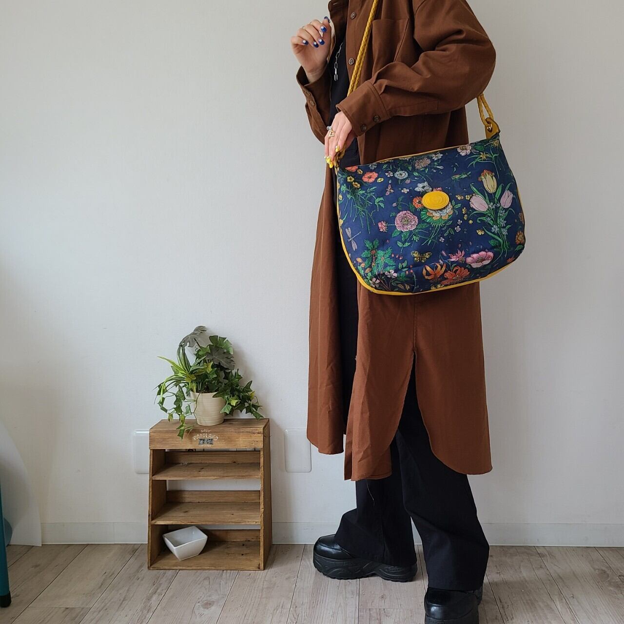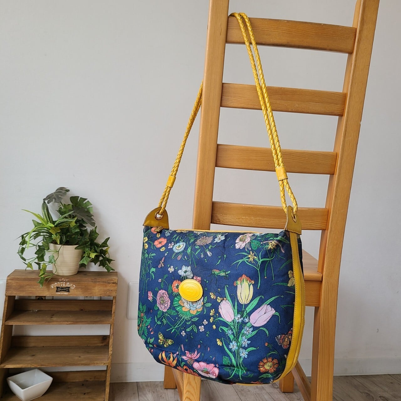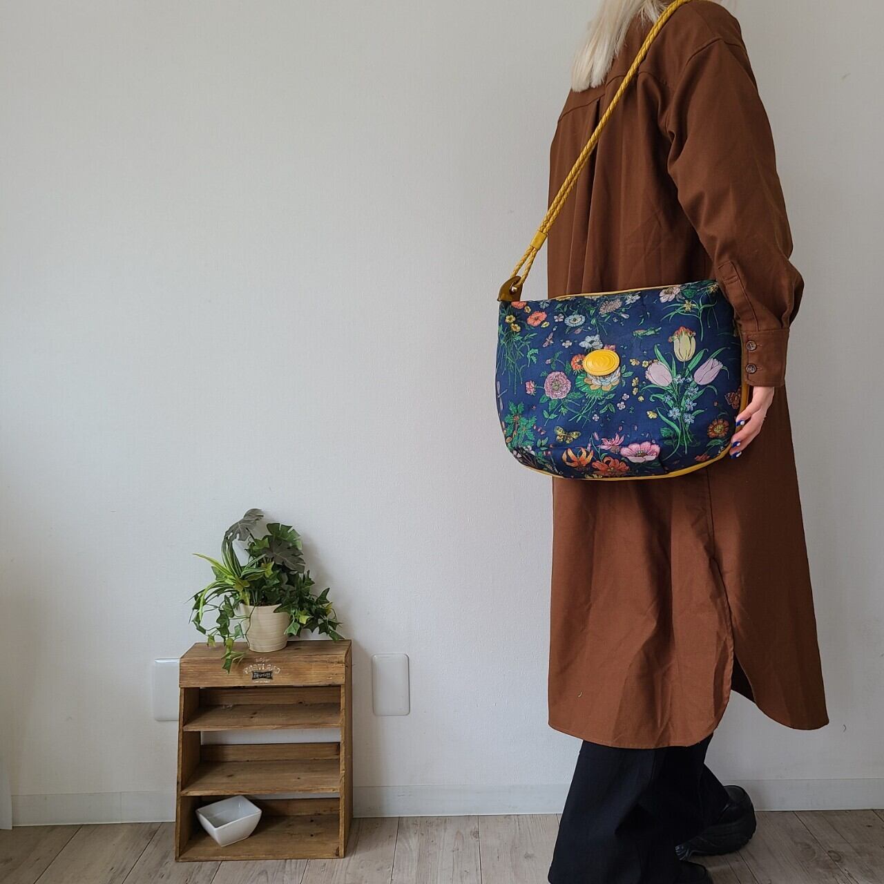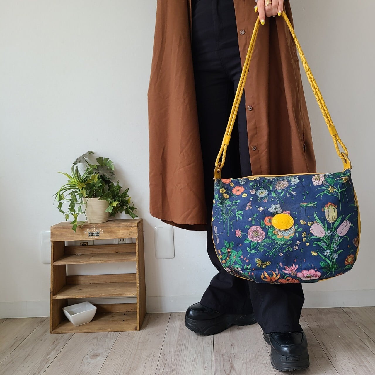 側面とショルダー部分は明るいイエローのレザーであしらわれ、華やかでありながら落ち着いた色合いでコーディネートにも合わせやすい一点です。