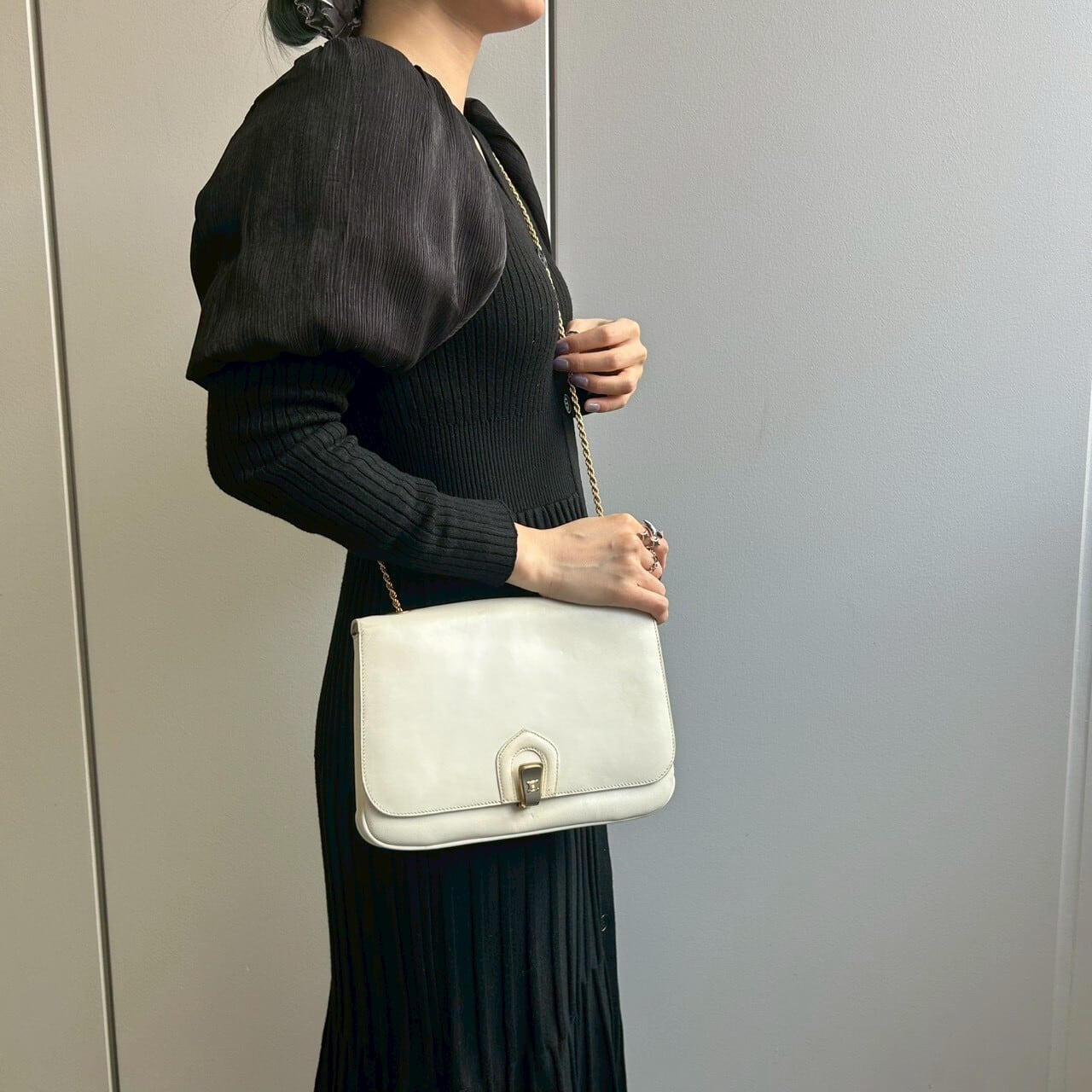 ホワイトのボディにメタル映える、高級感のあるショルダーバッグ。