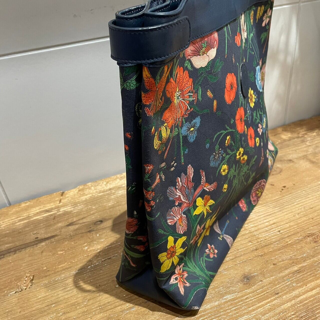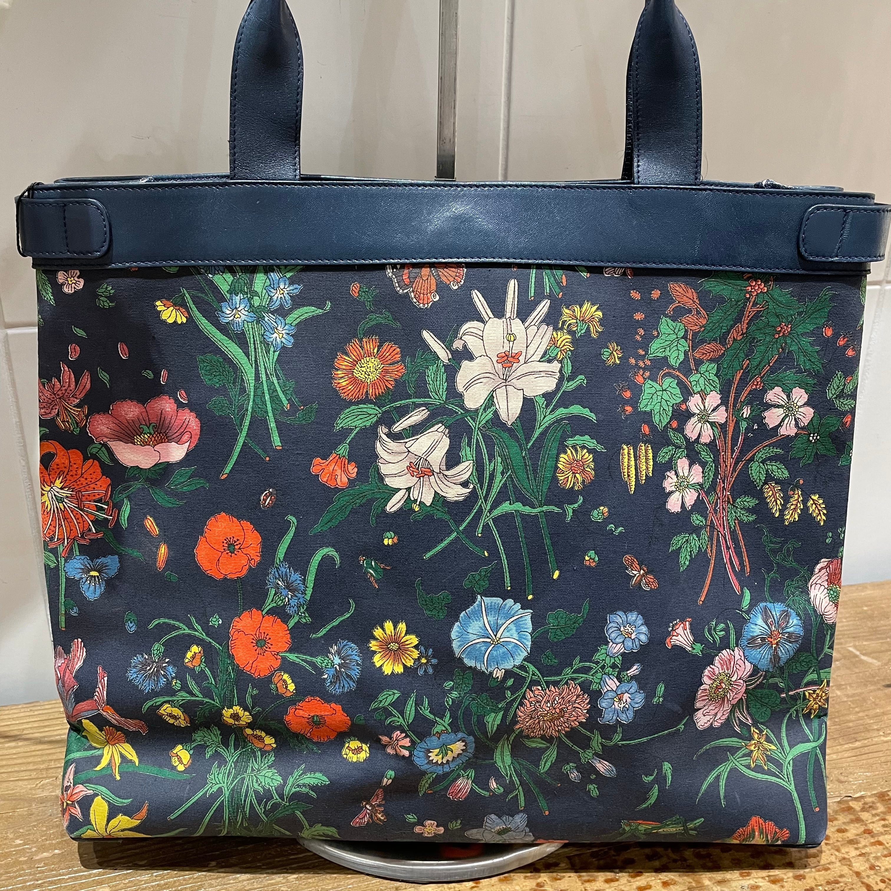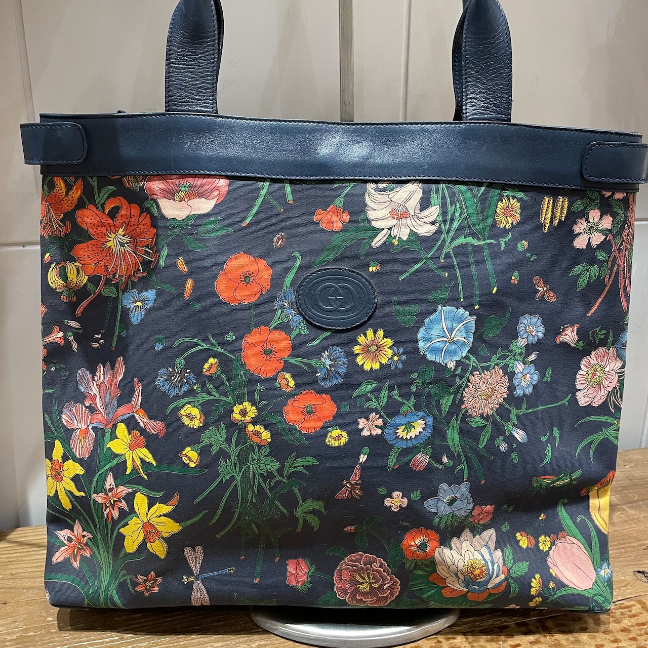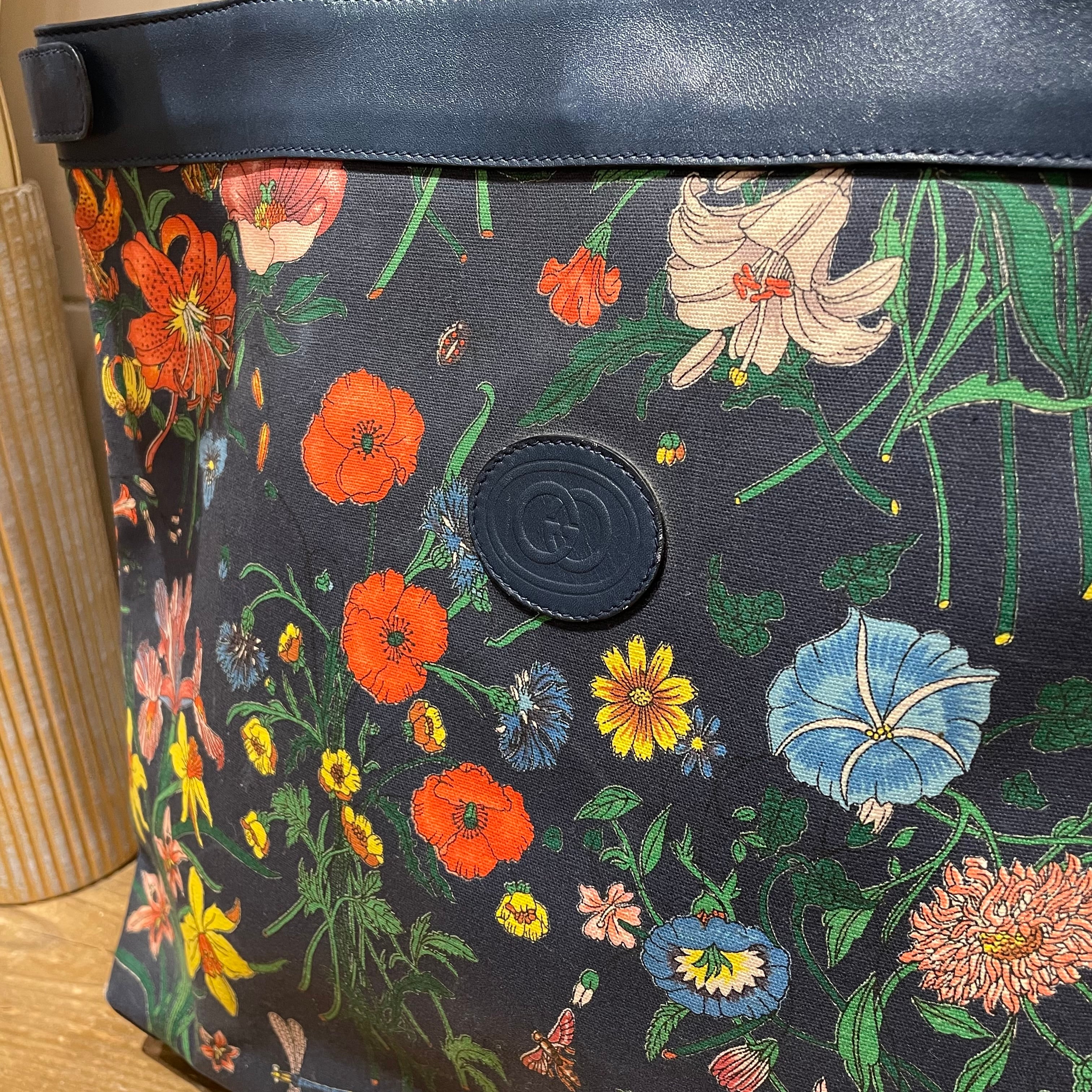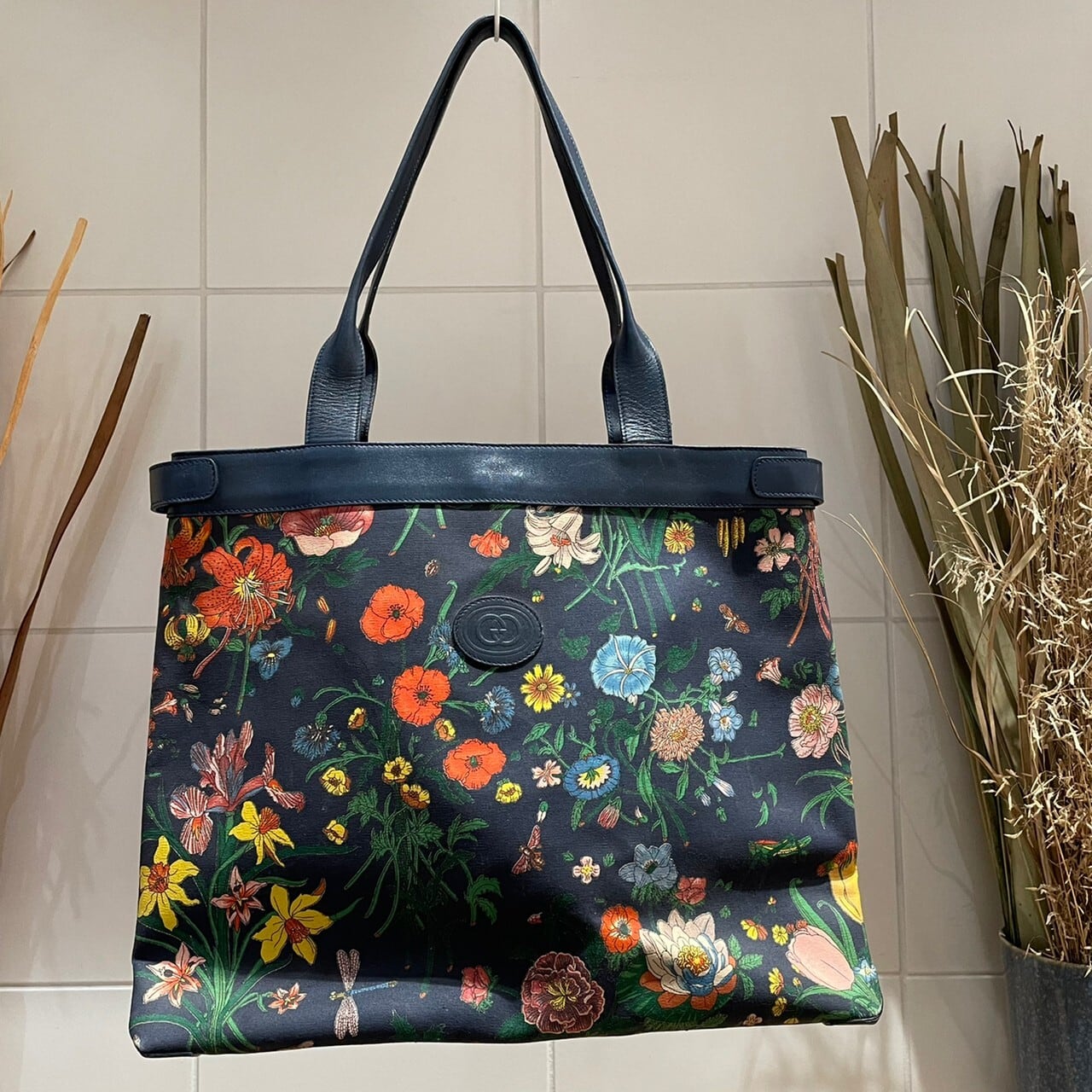 鮮やかな花や蝶の細密画を織り込んだ人気のフローラ。フローラの中でも特に珍しいネイビー地のナイトフローラはGUCCIファンにはたまらない一点。