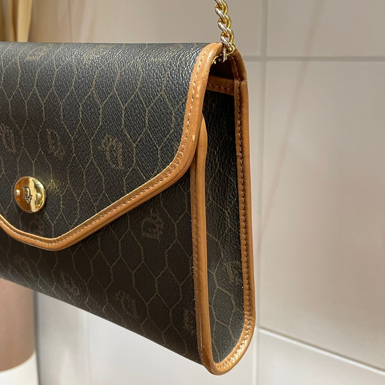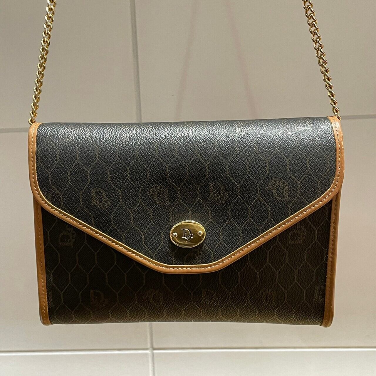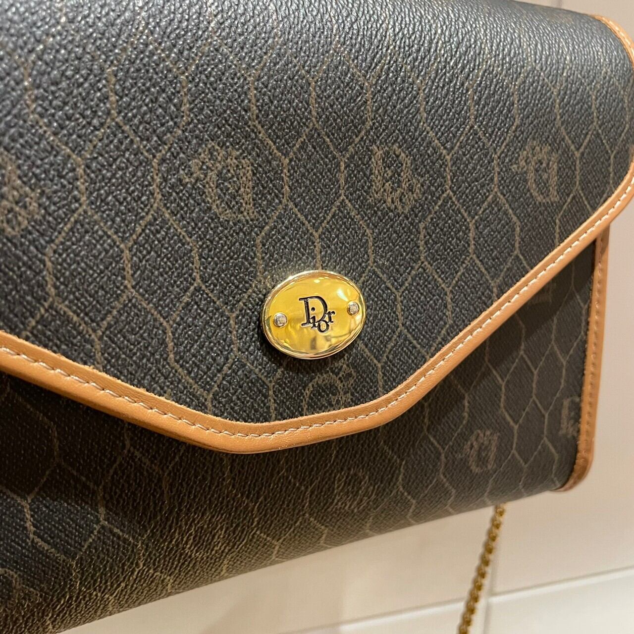 Diorの象徴、蜂の巣をイメージしたハニカム柄とブラウンのパイピングが目を惹く一点。