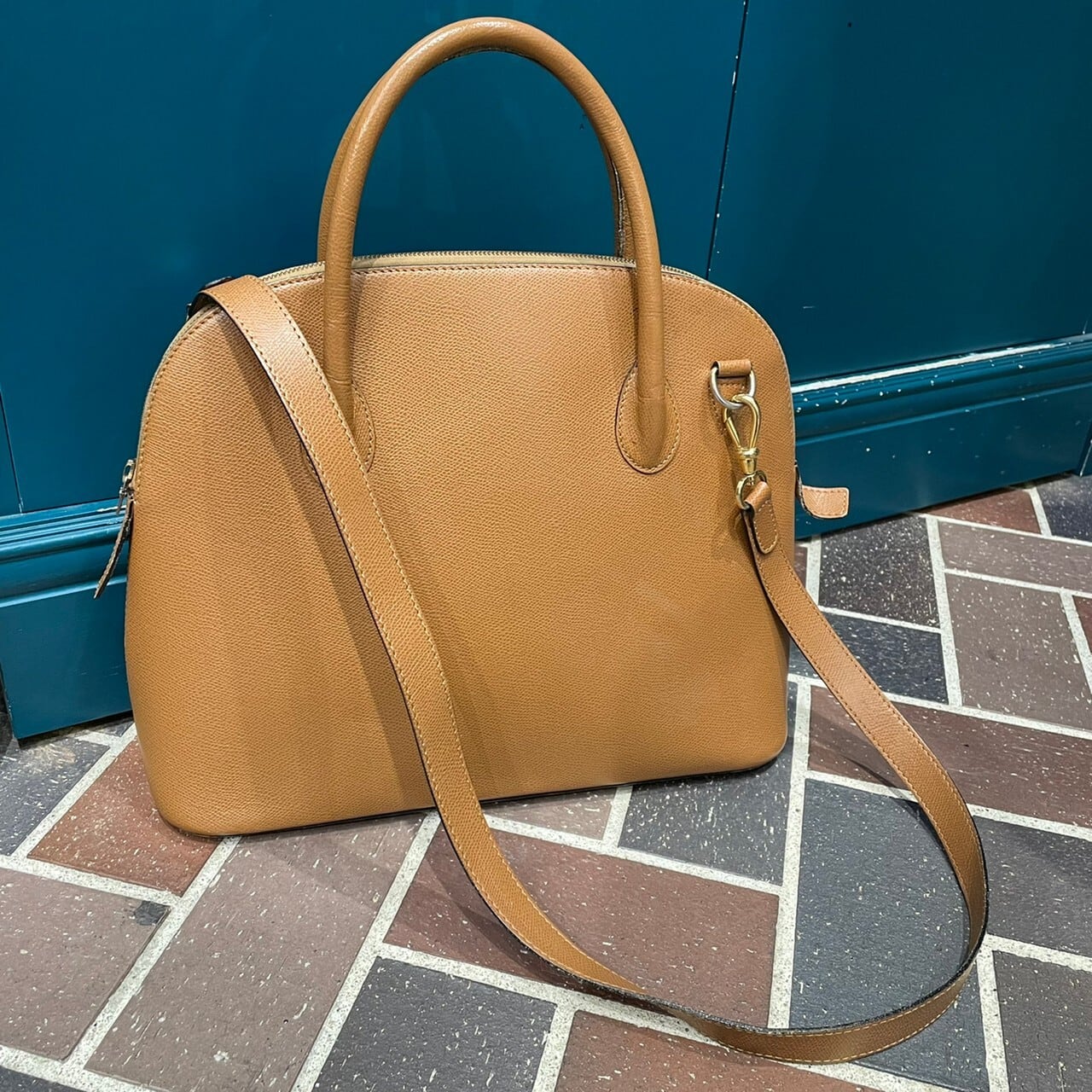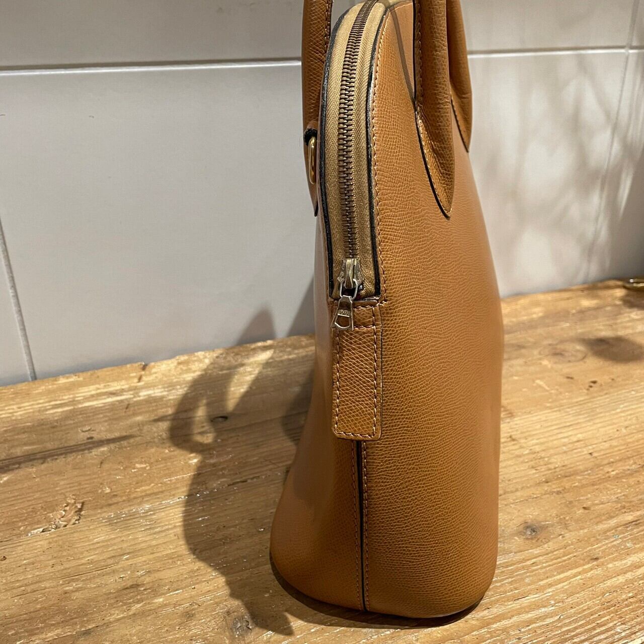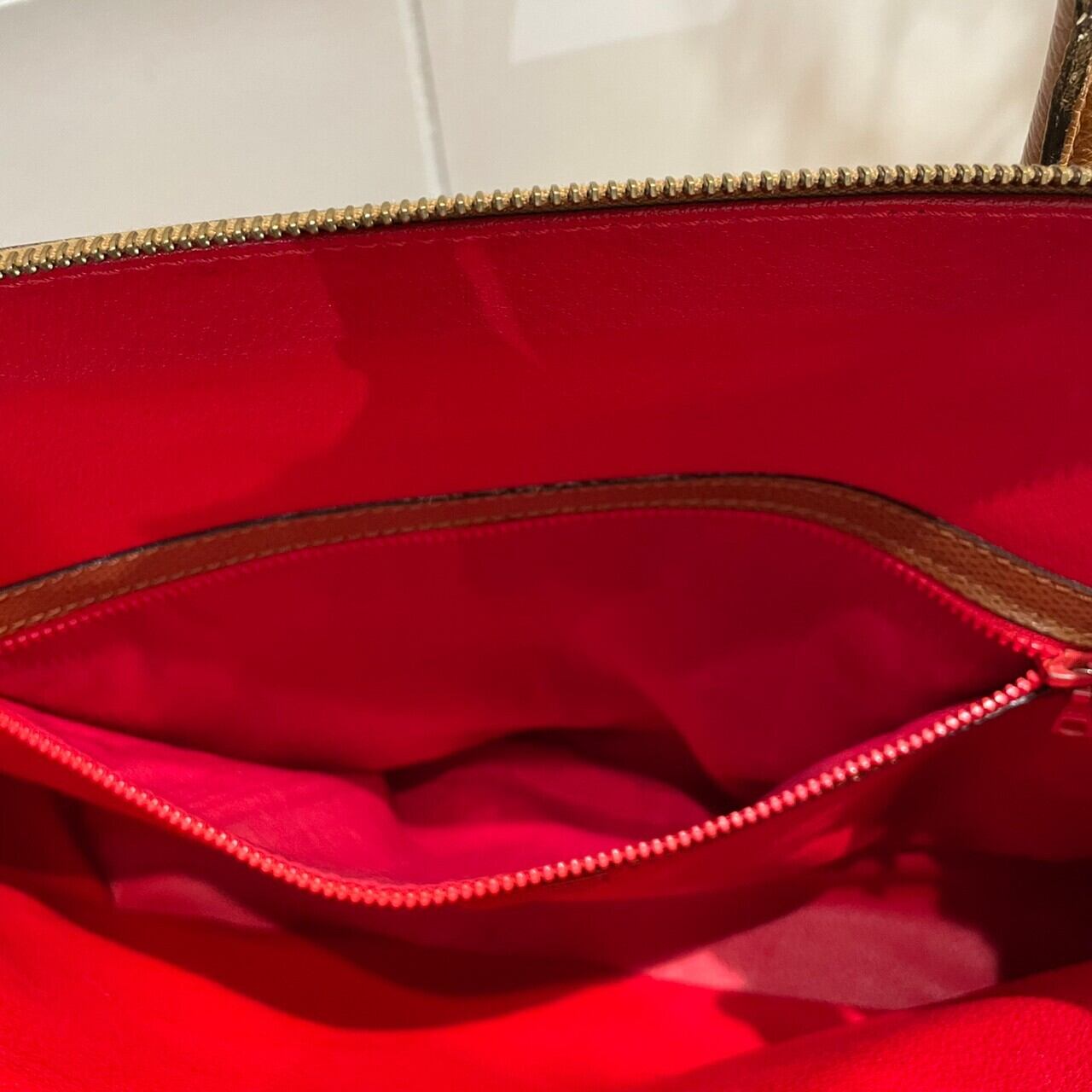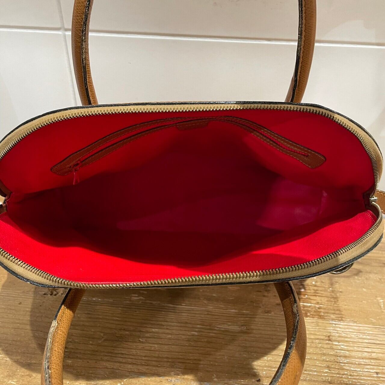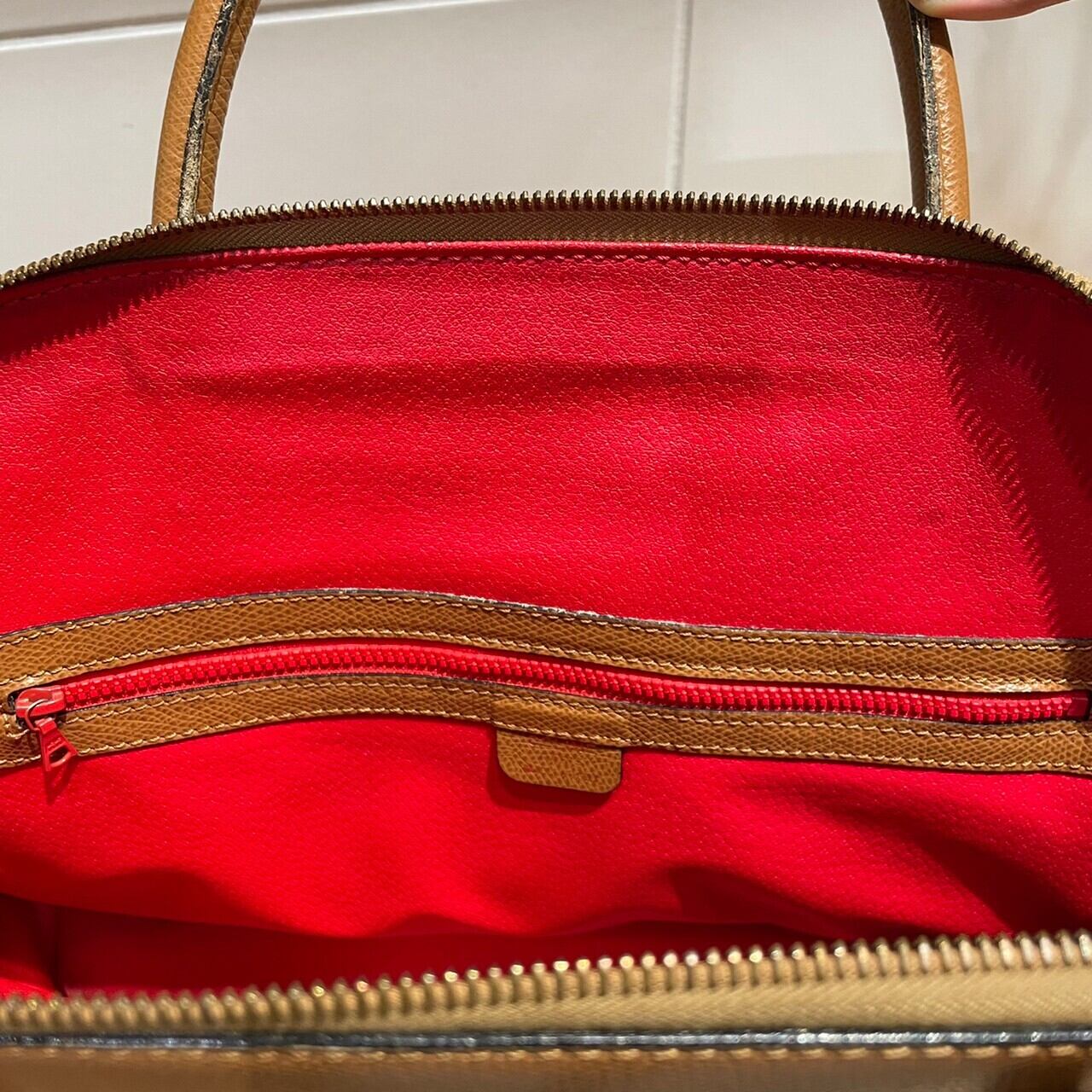 ボディの落ち着いたブラウンとバッグ内部の赤色の対比が美しい一点です。