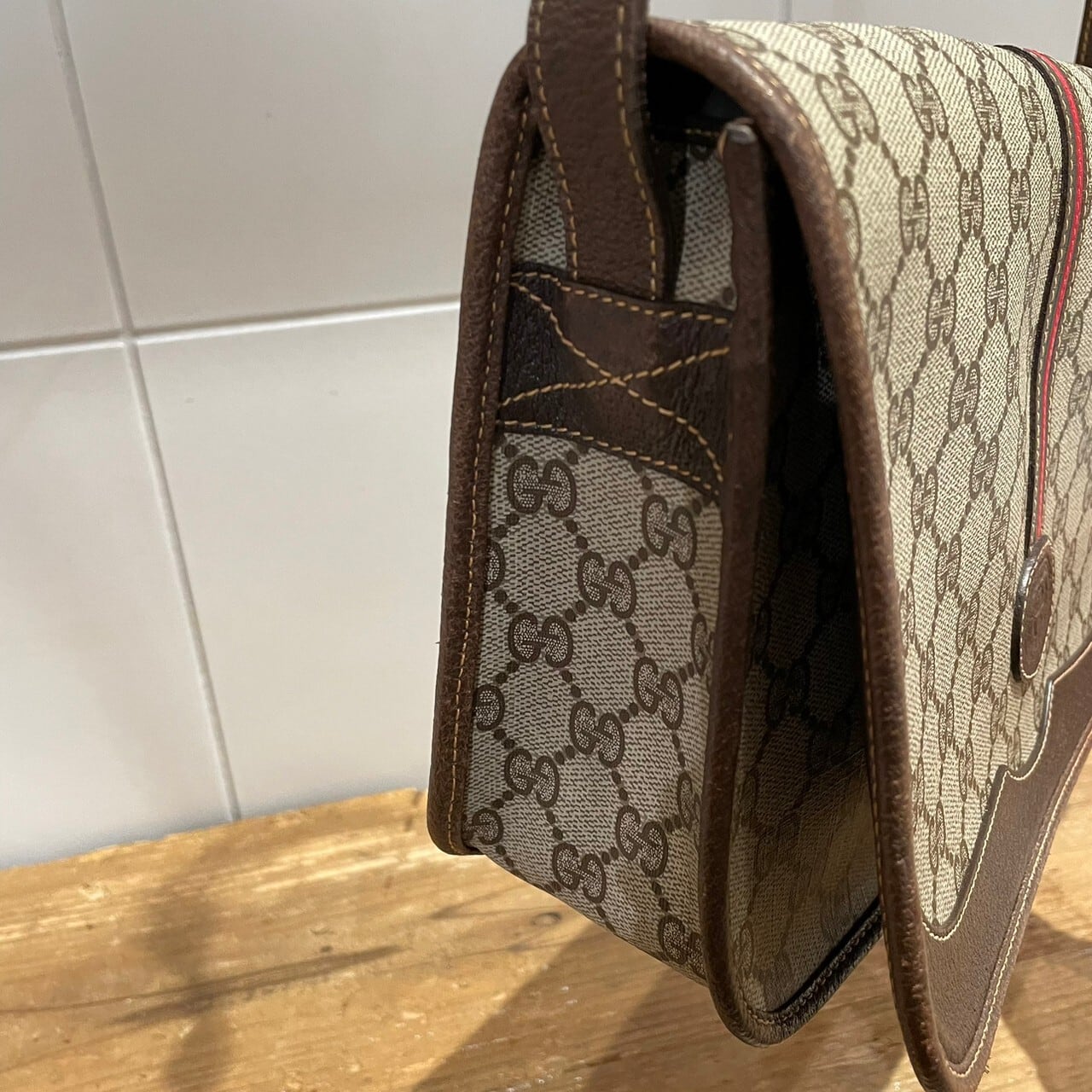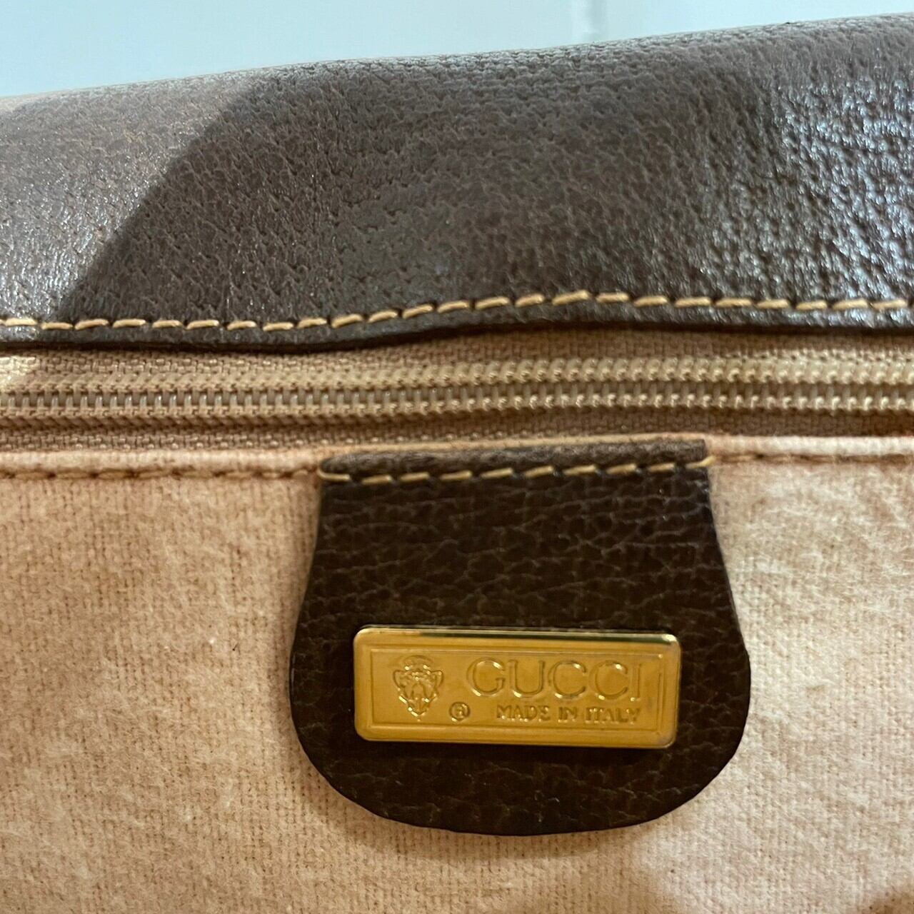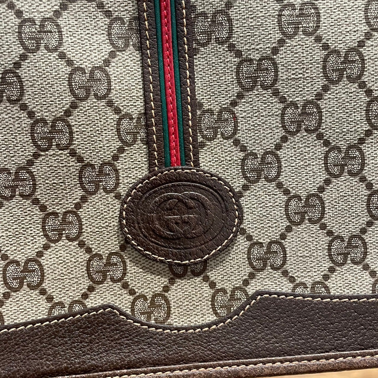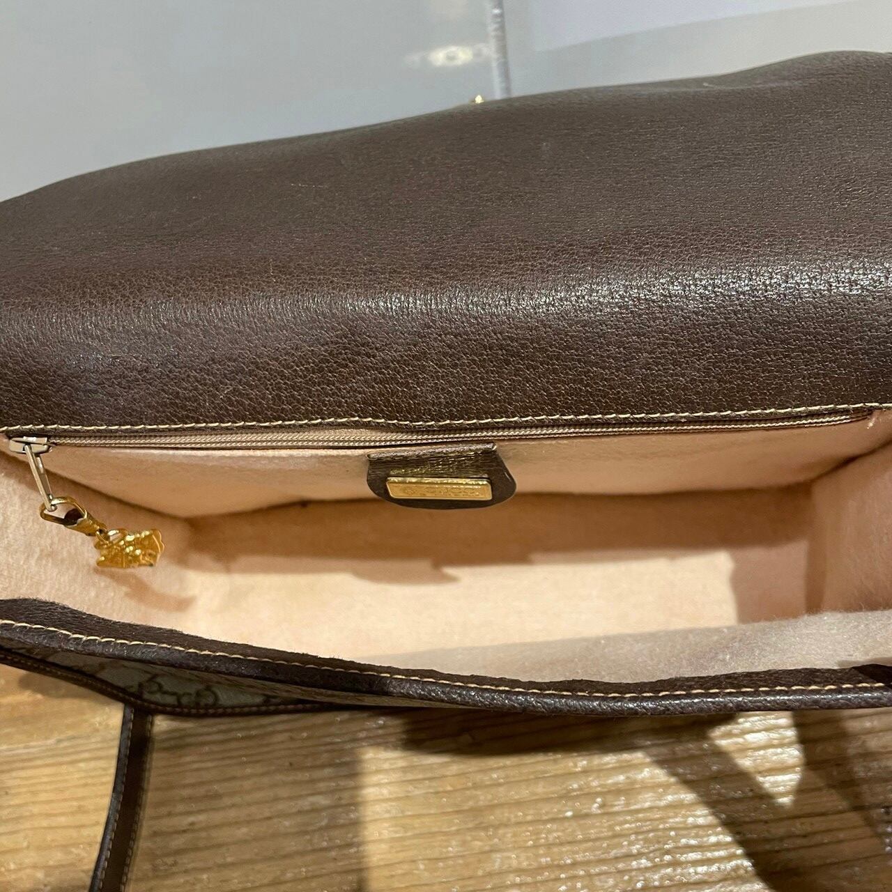 深めのブラウンのレザーとシェリーラインのアクセントが効いたオールドグッチならではのデザインです。
