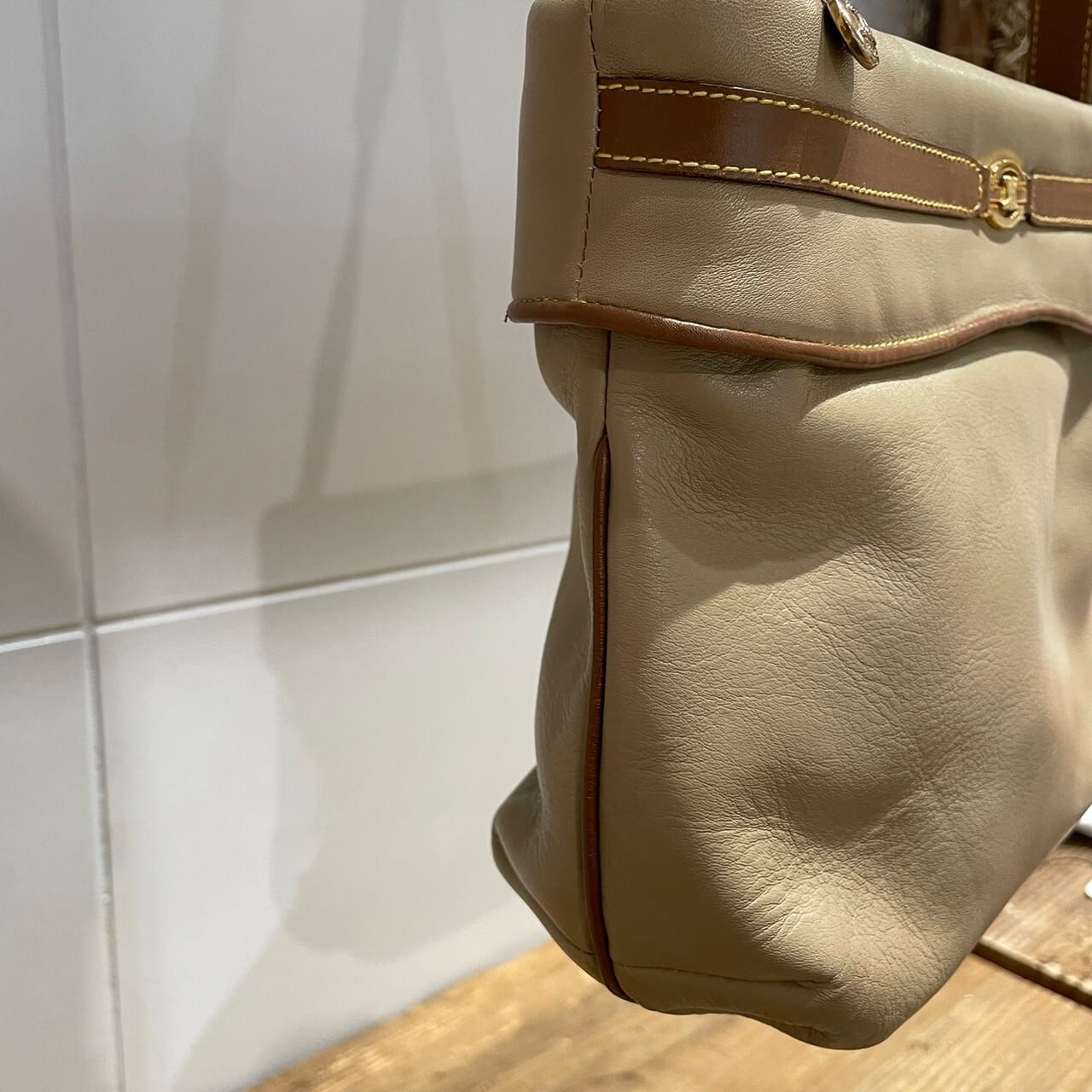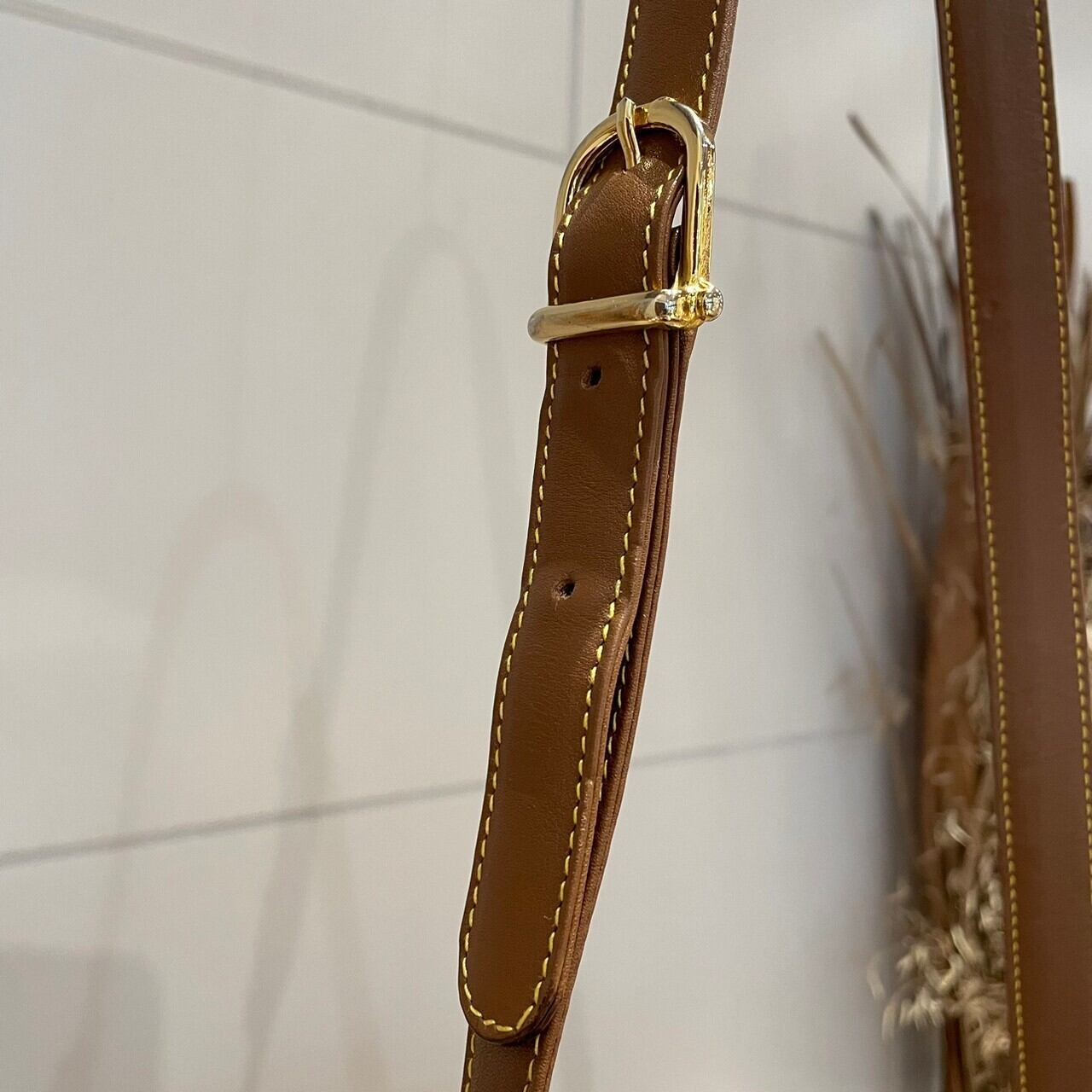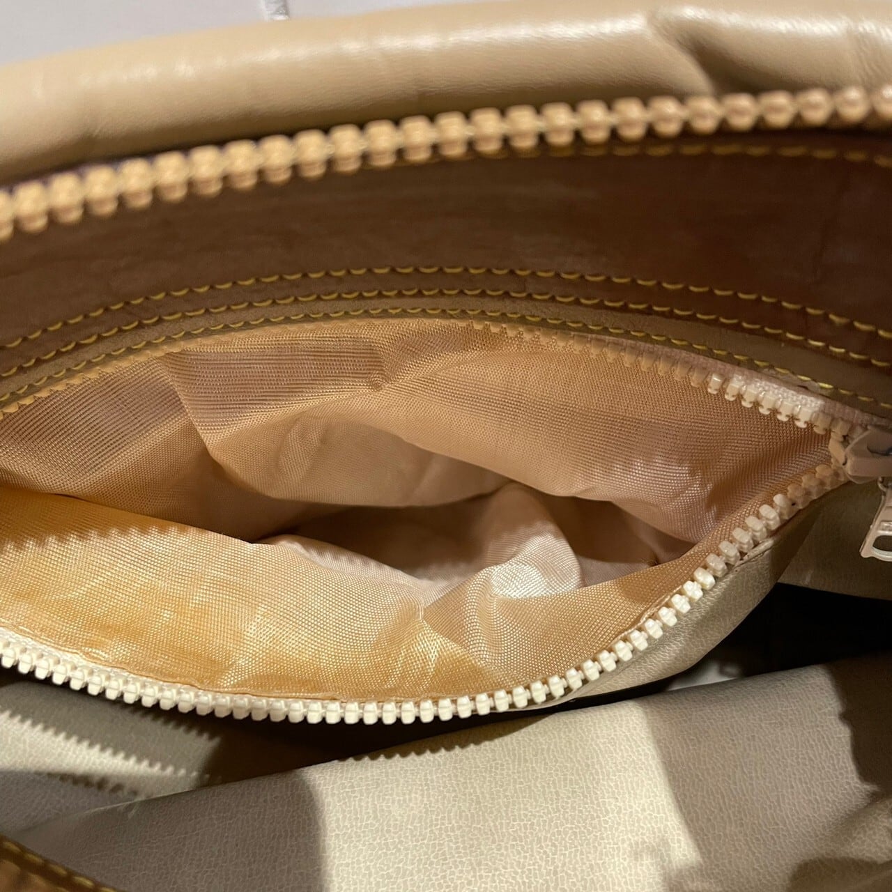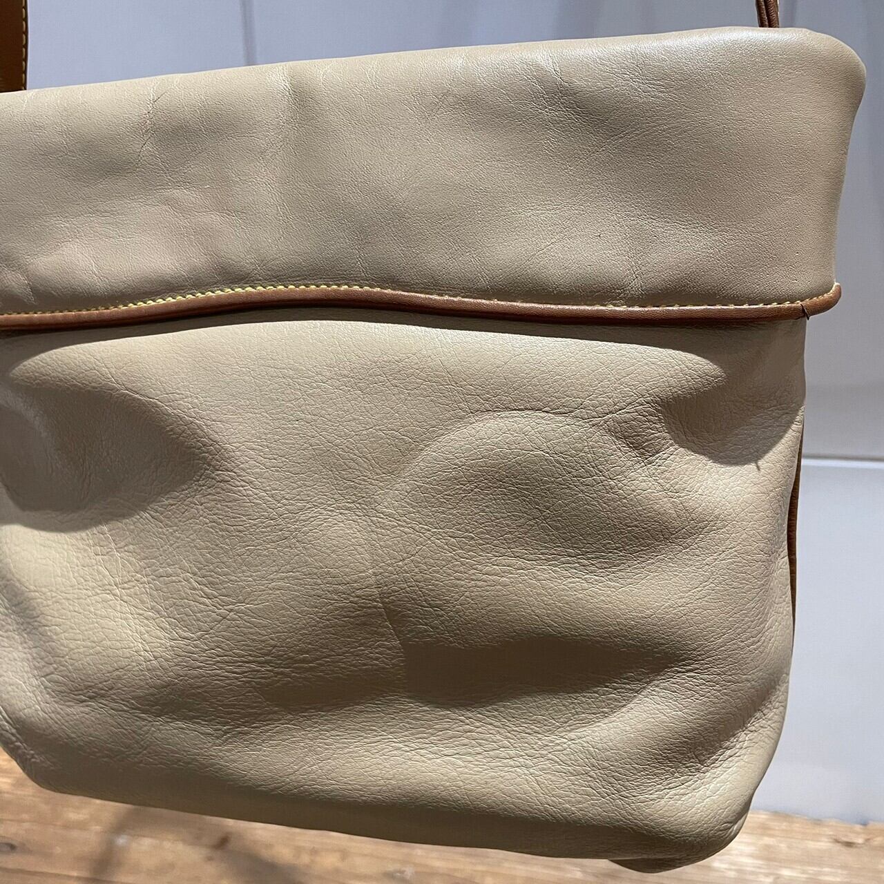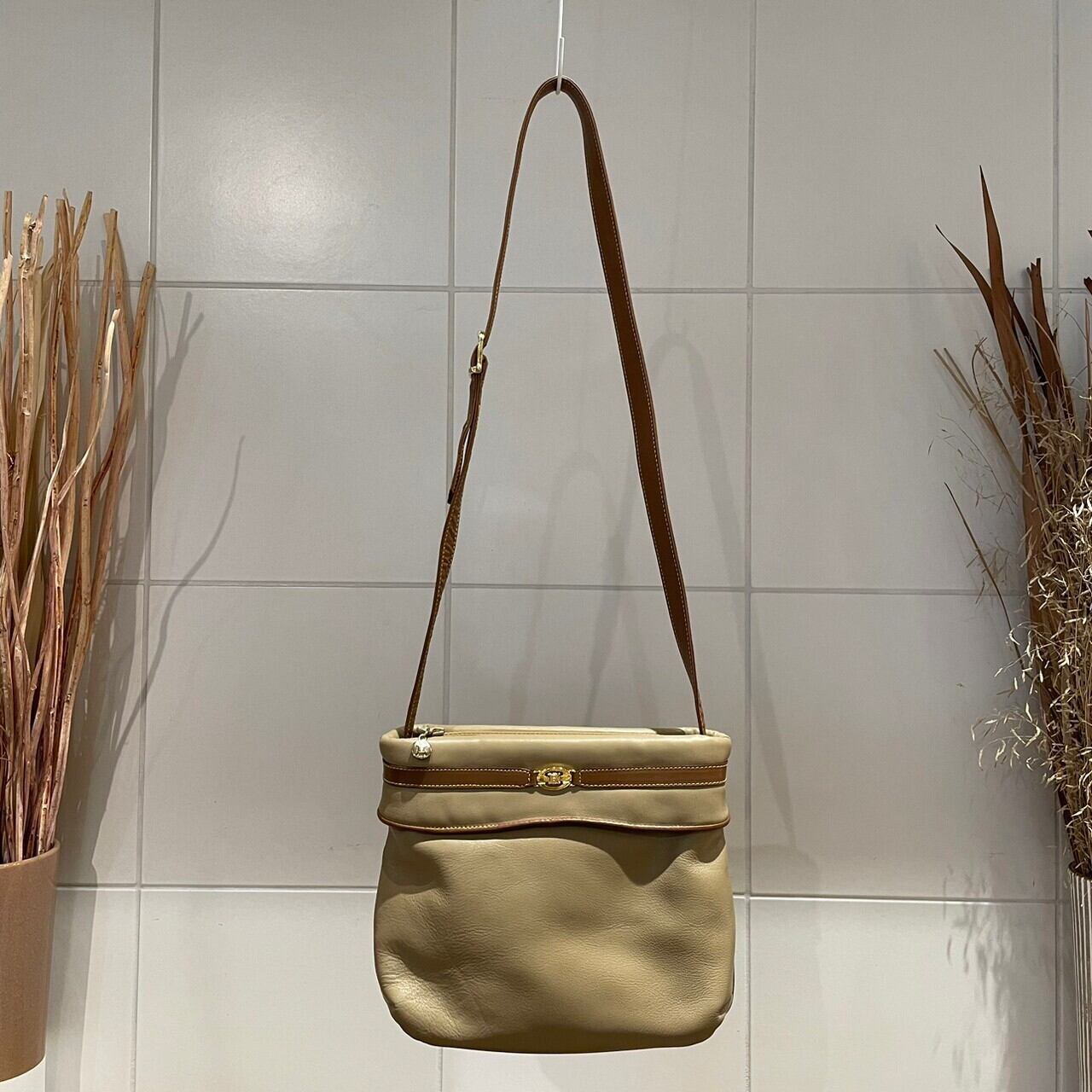 ブラウンベージュのレザーボディが柔らかな印象のショルダーバッグ。