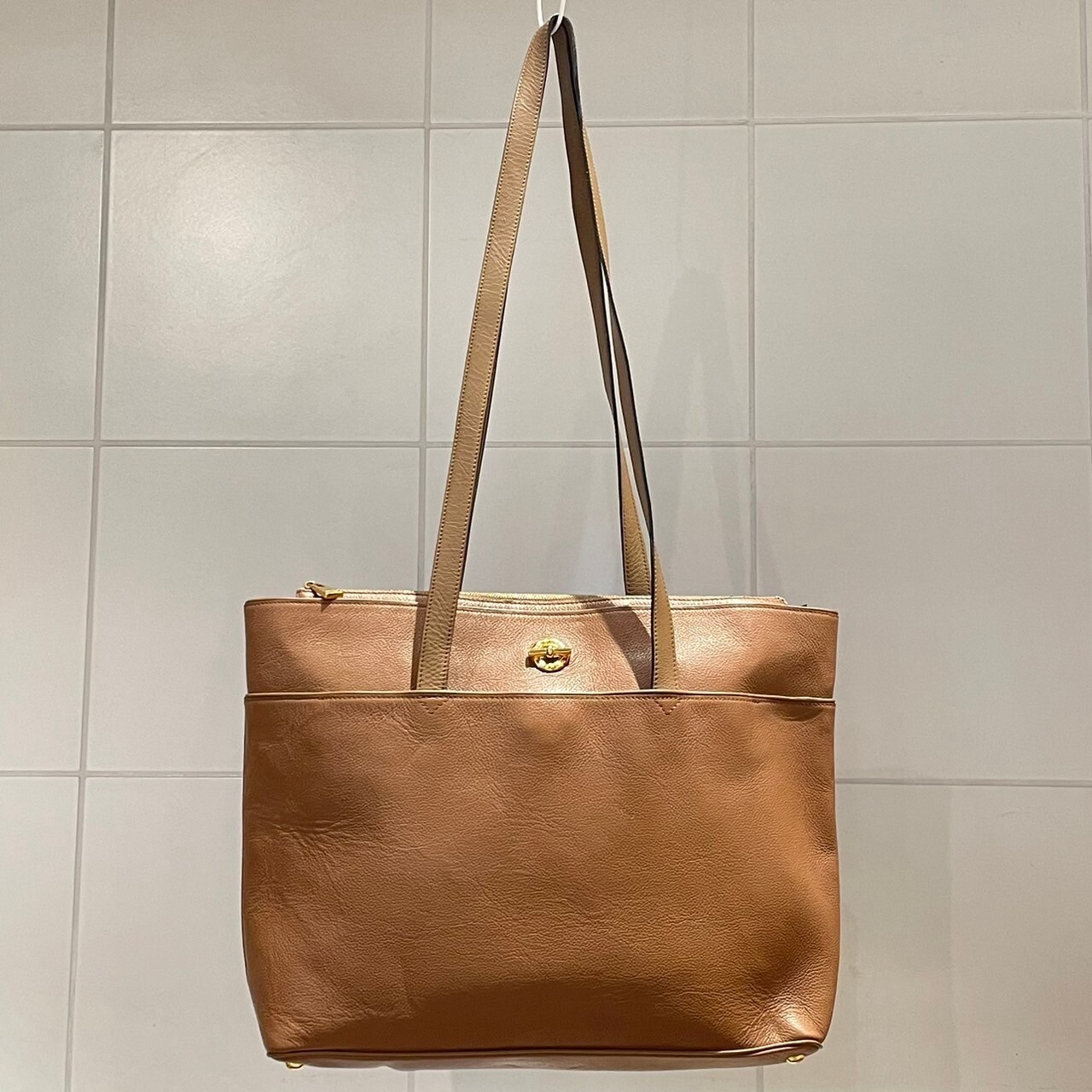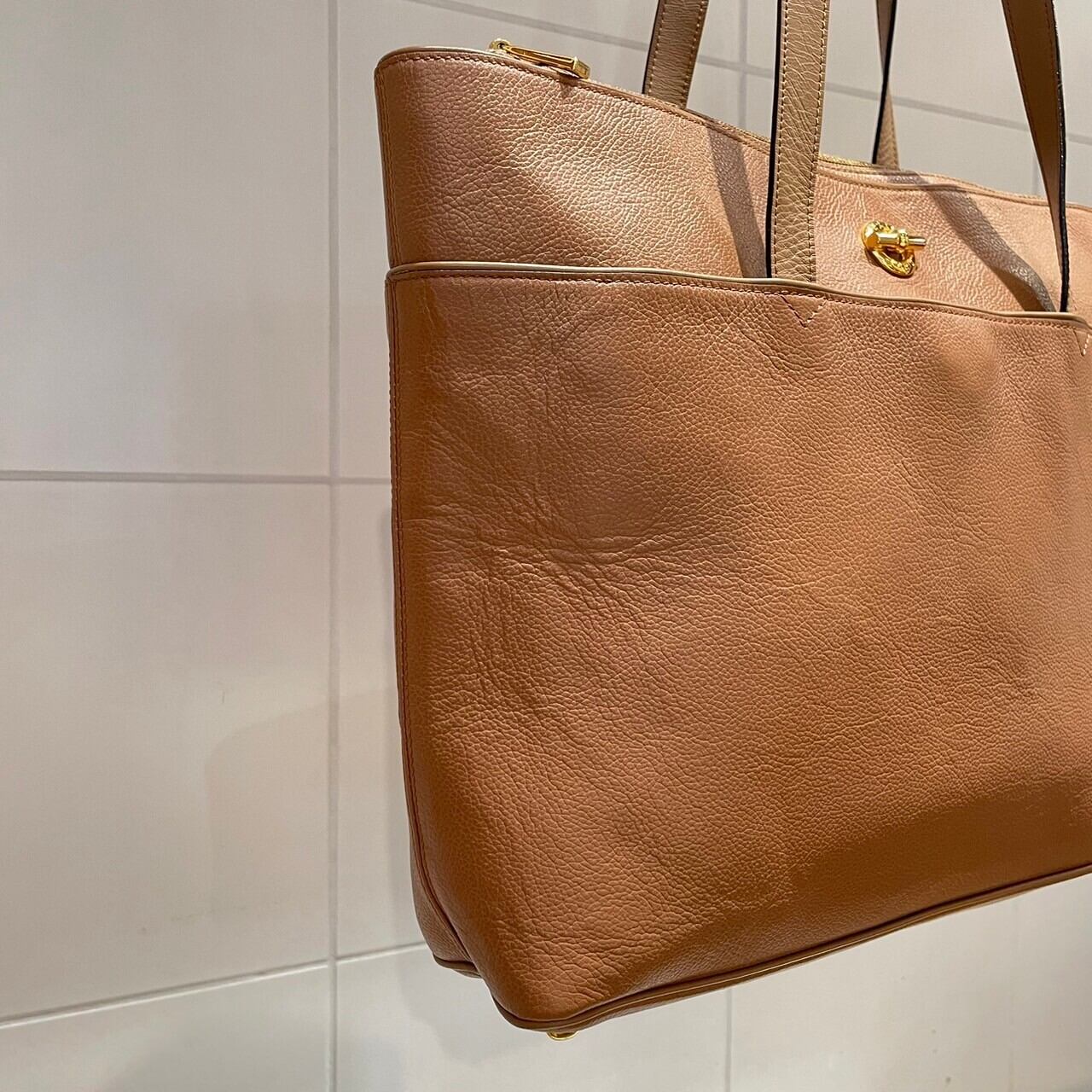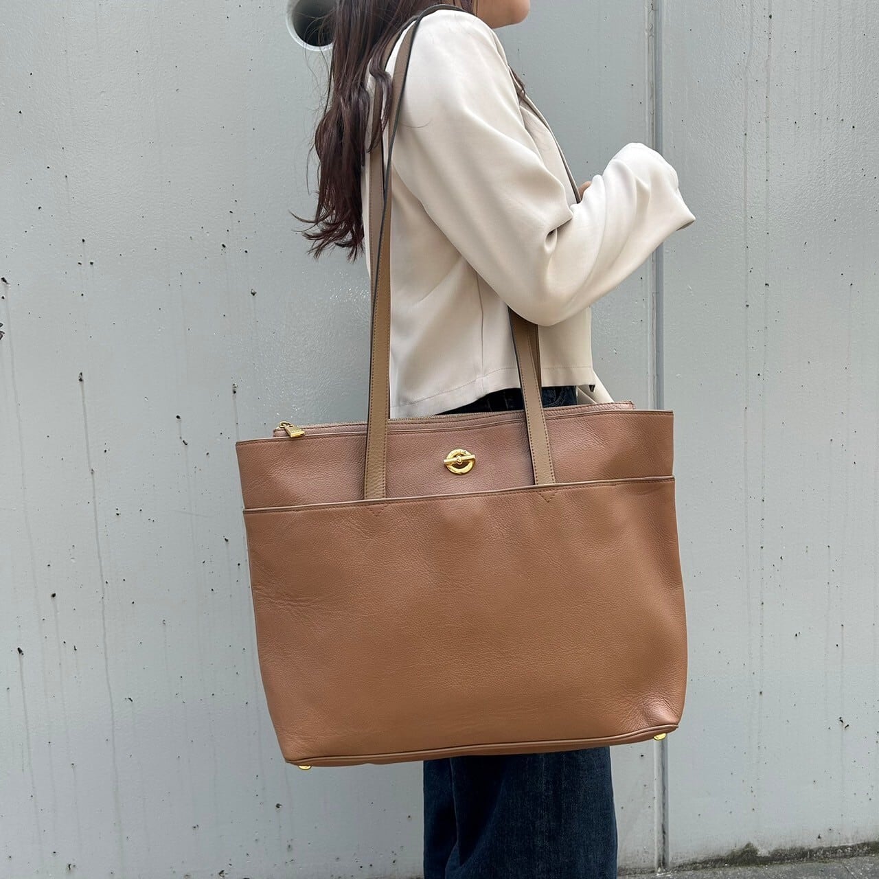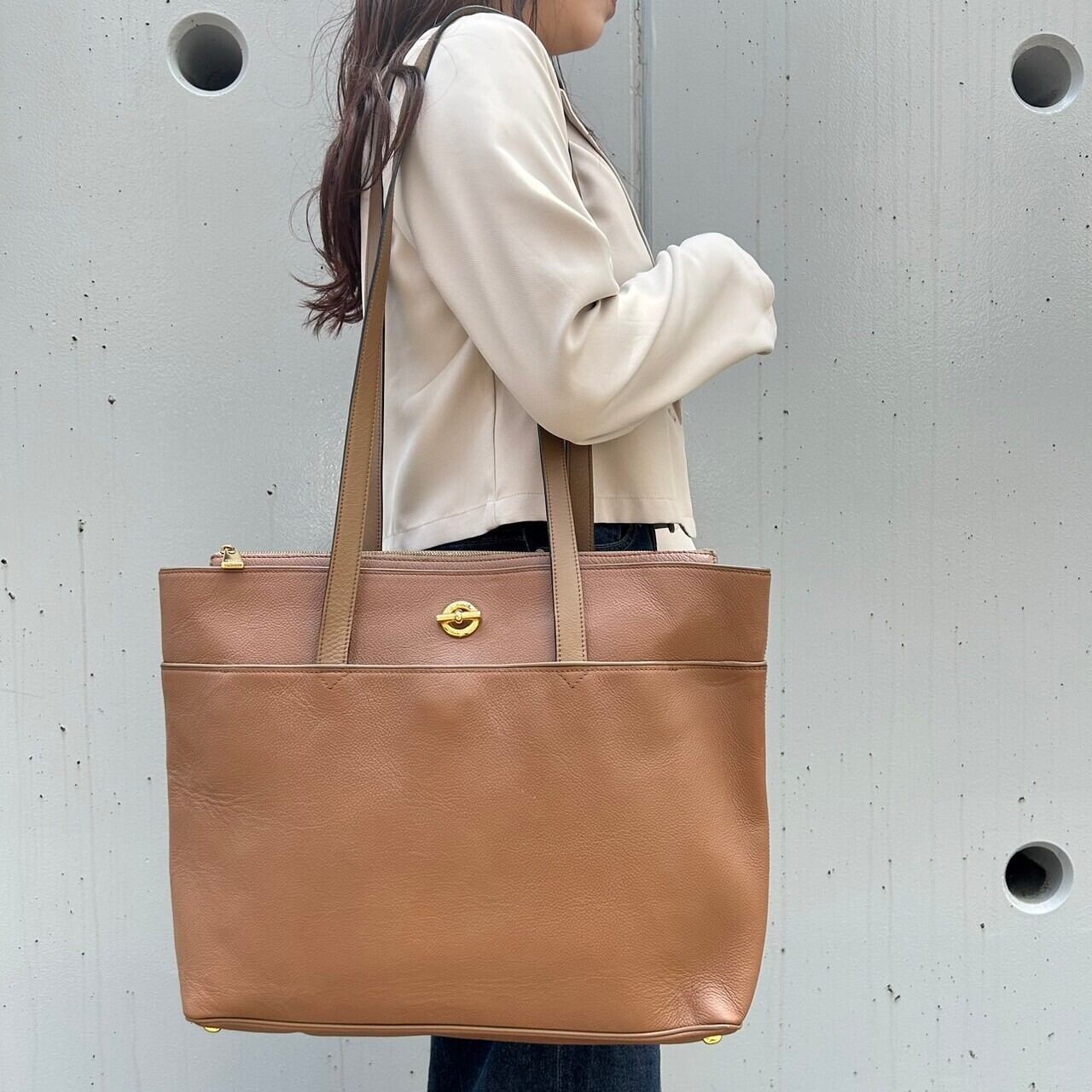 柔らかなブラウンのボディとバッグ内部のレッドのコントラストが美しいハンドバッグが入荷。